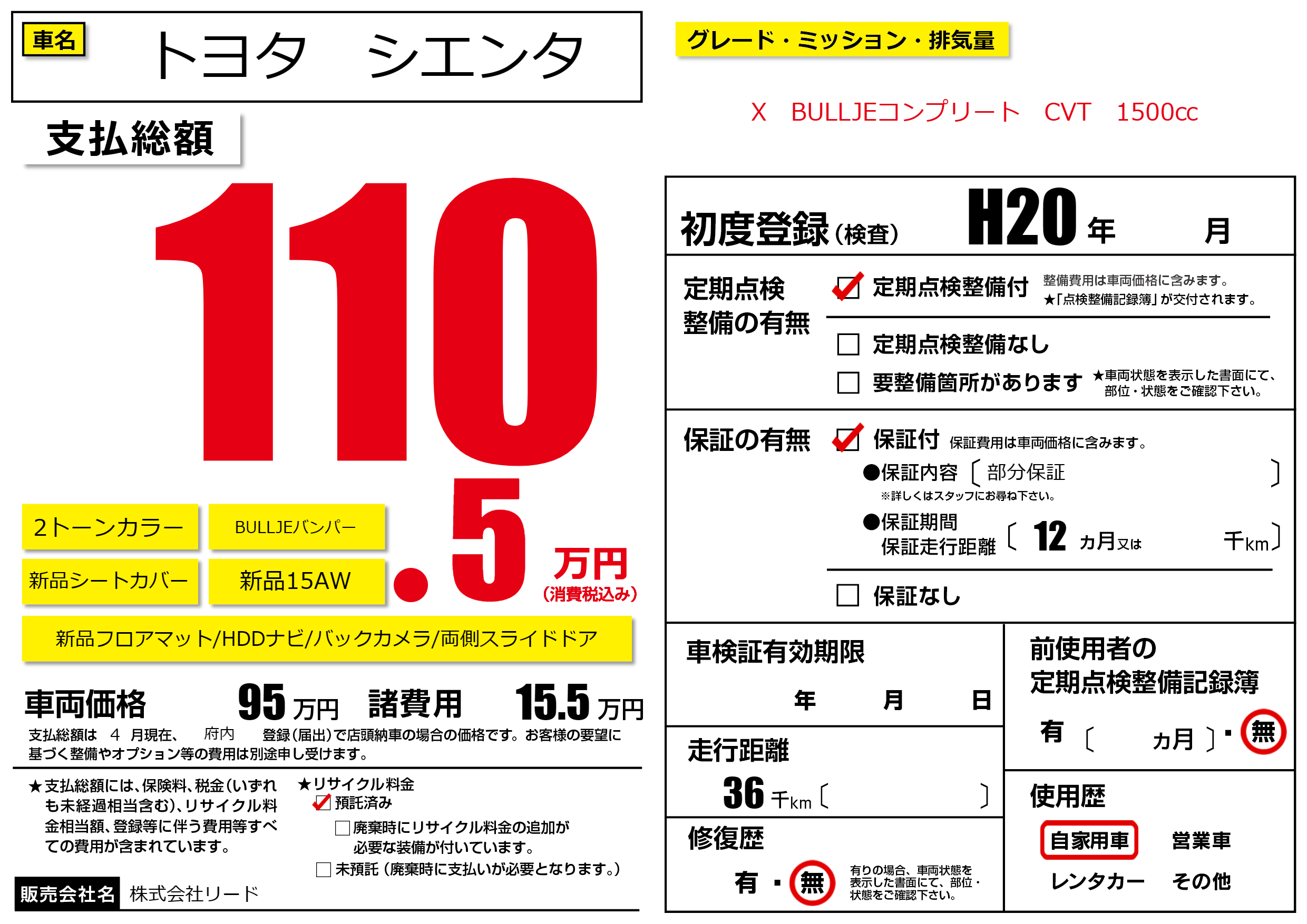 保証付き 保証内容(部分保証) 12ヶ月または()千kmまで |