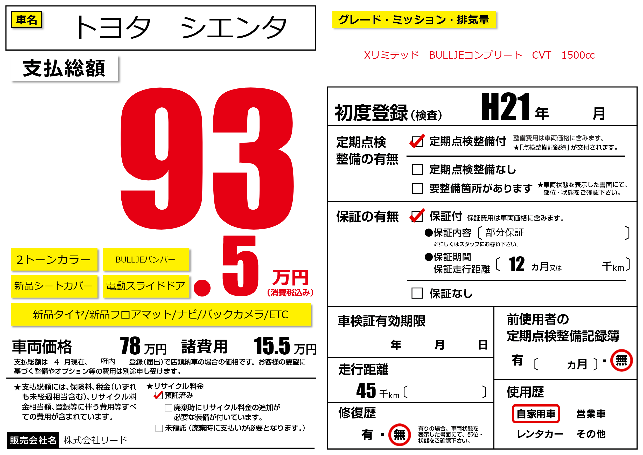 保証付き 保証内容(部分保証) 12ヶ月または()千kmまで |