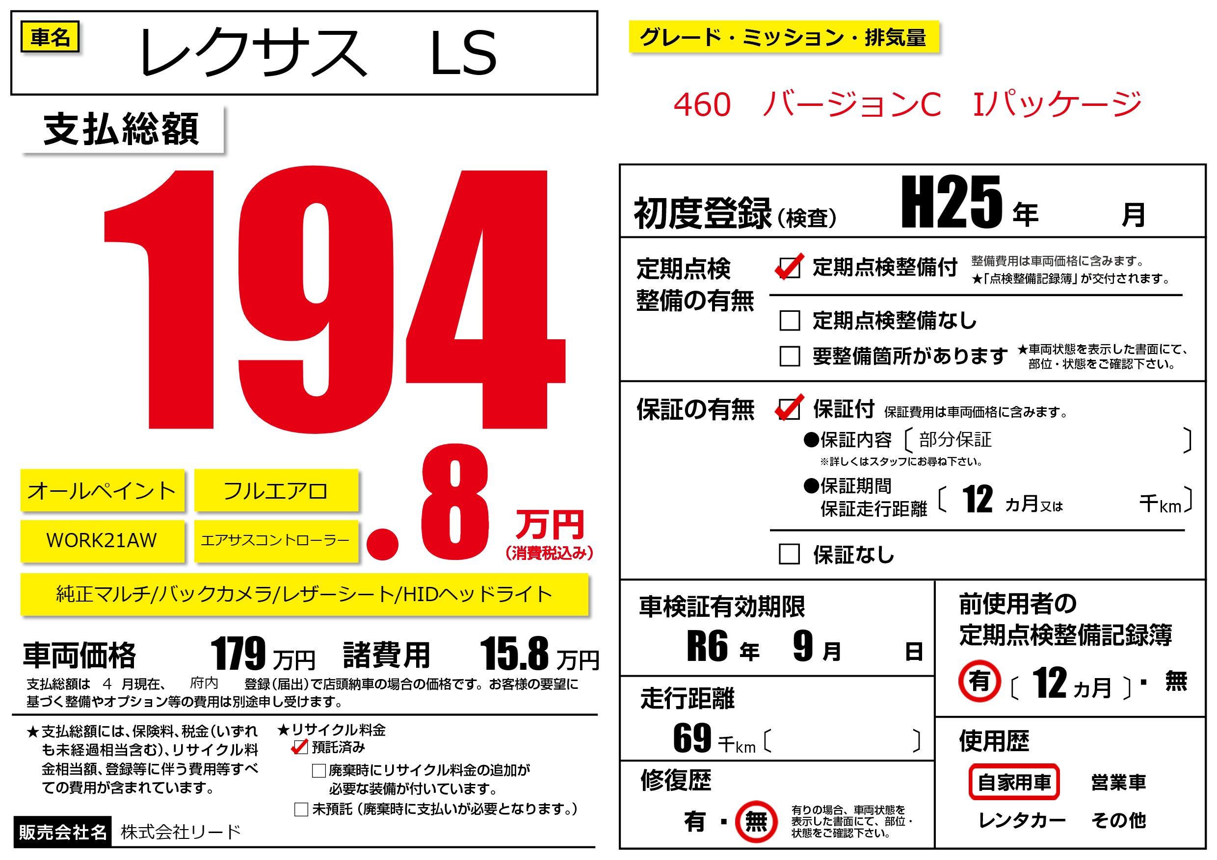 | 車名 | レクサス LS | グレード ミッション 排気量 |