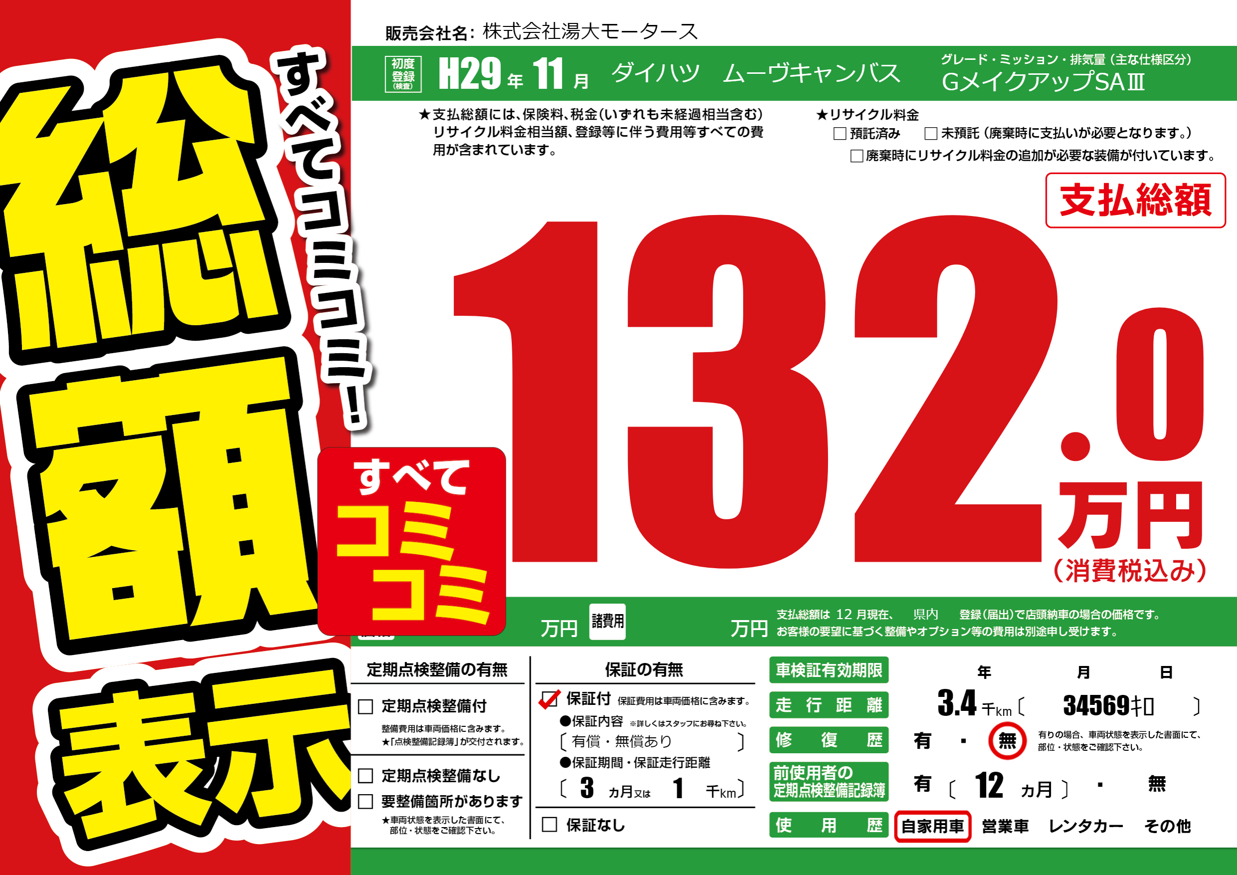 保証付き 保証内容(有償・無償あり) 3ヶ月または(1)千kmまで |