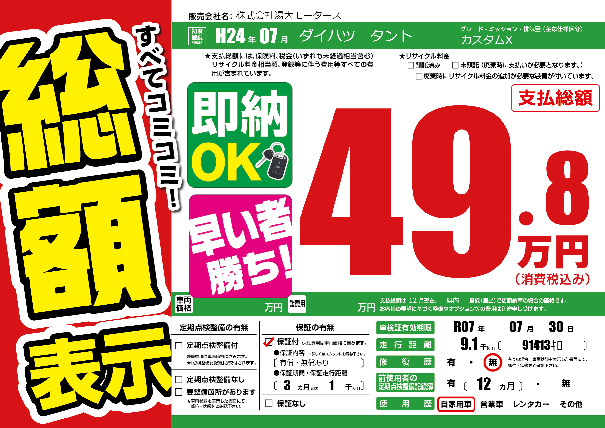 | 車名 | ダイハツ タント | グレード ミッション 排気量 |