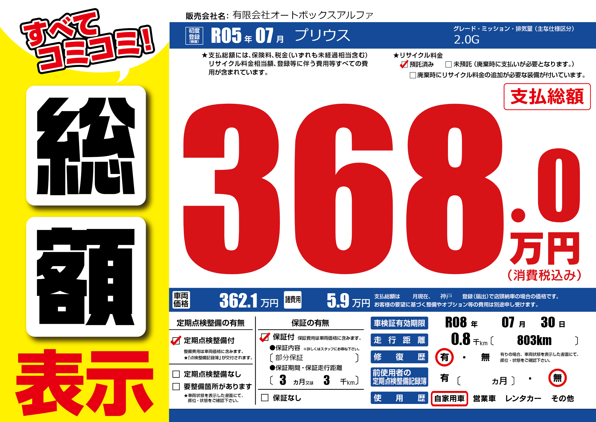 | 車名 | プリウス | グレード ミッション 排気量 |