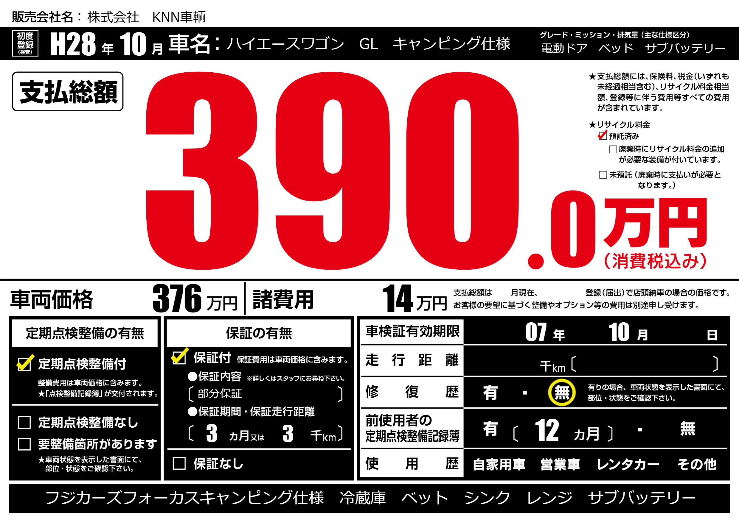| 車名 | ハイエースワゴン GL キャンピング仕様 | グレード ミッション 排気量 |