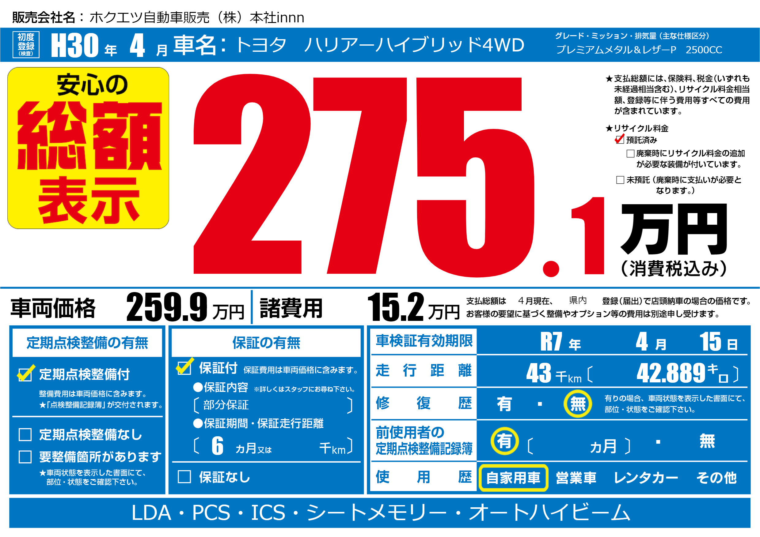 | 車名 | トヨタ ハリアーハイブリッド4WD | グレード ミッション 排気量 |