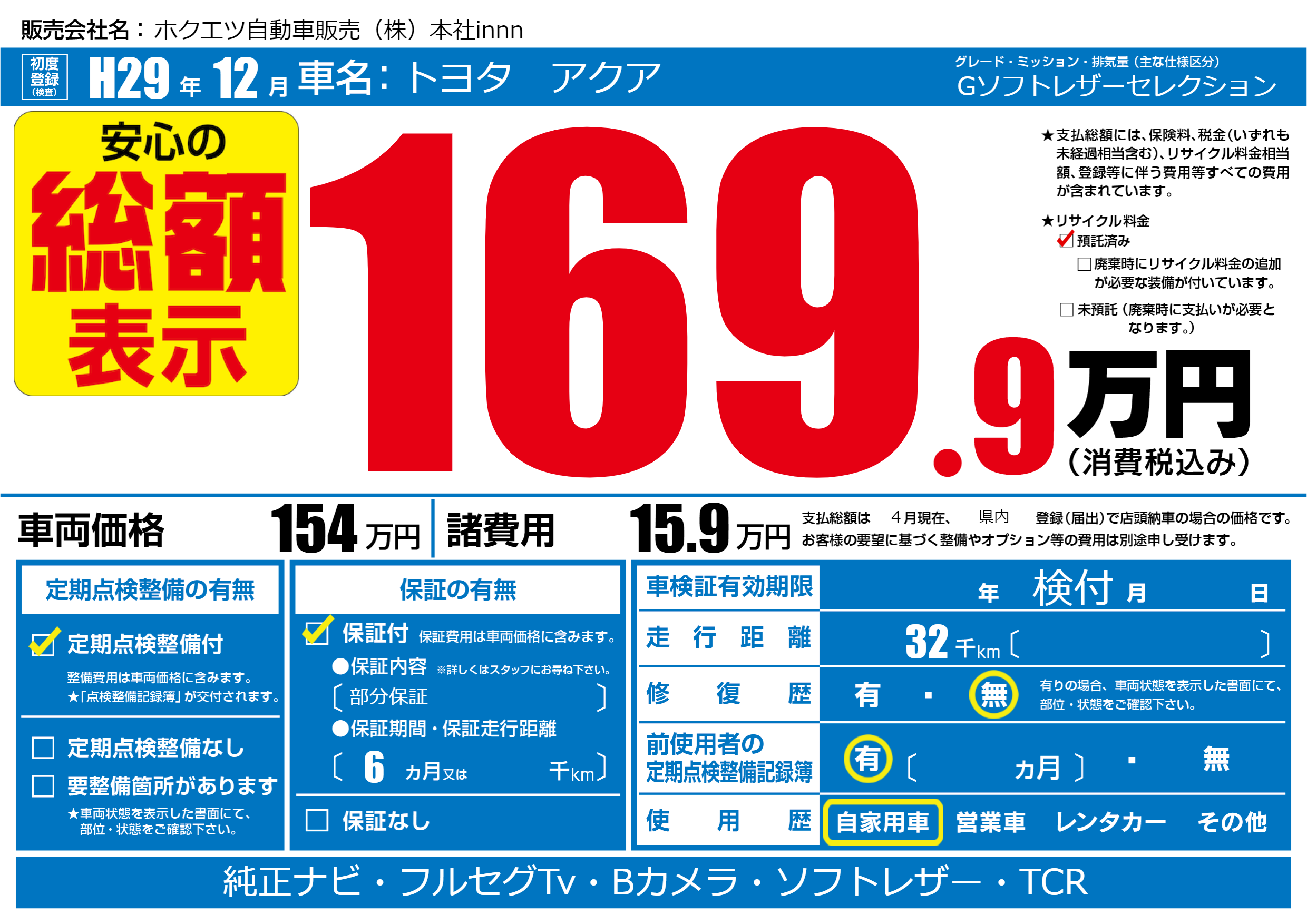 | 車名 | トヨタ アクア | グレード ミッション 排気量 |