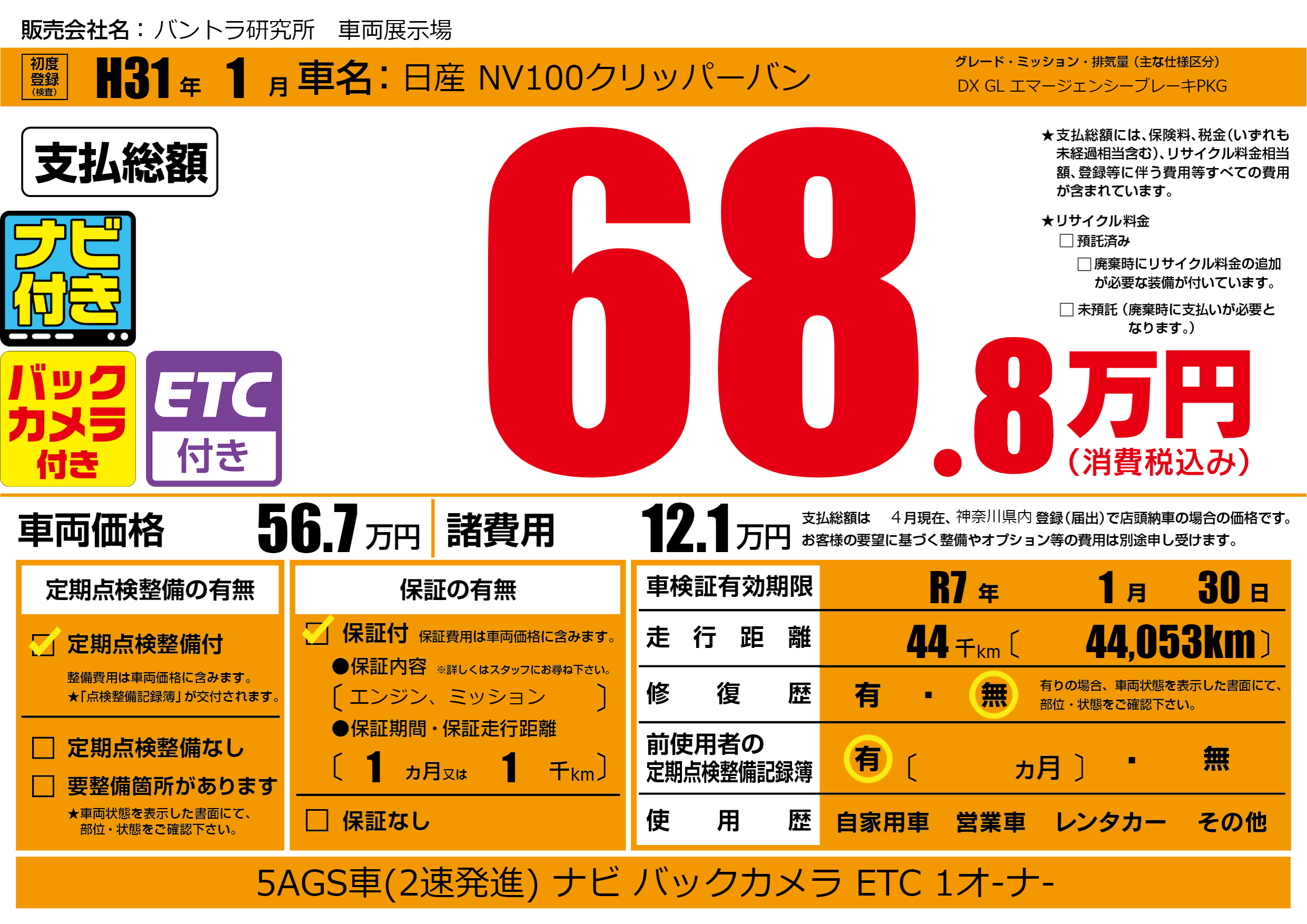 | 車名 | 日産 NV100クリッパーバン | グレード ミッション 排気量 |