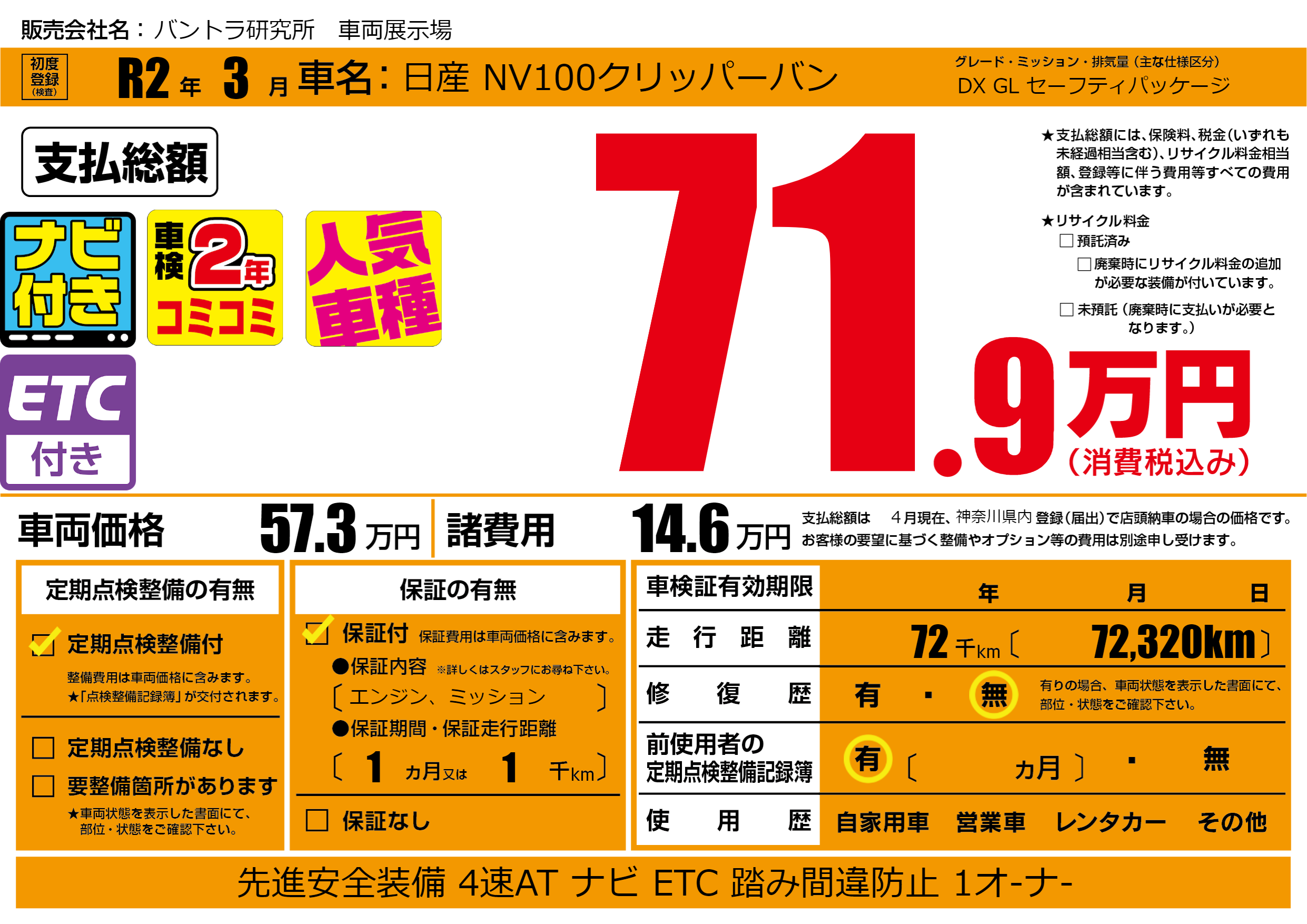 | 車名 | 日産 NV100クリッパーバン | グレード ミッション 排気量 |