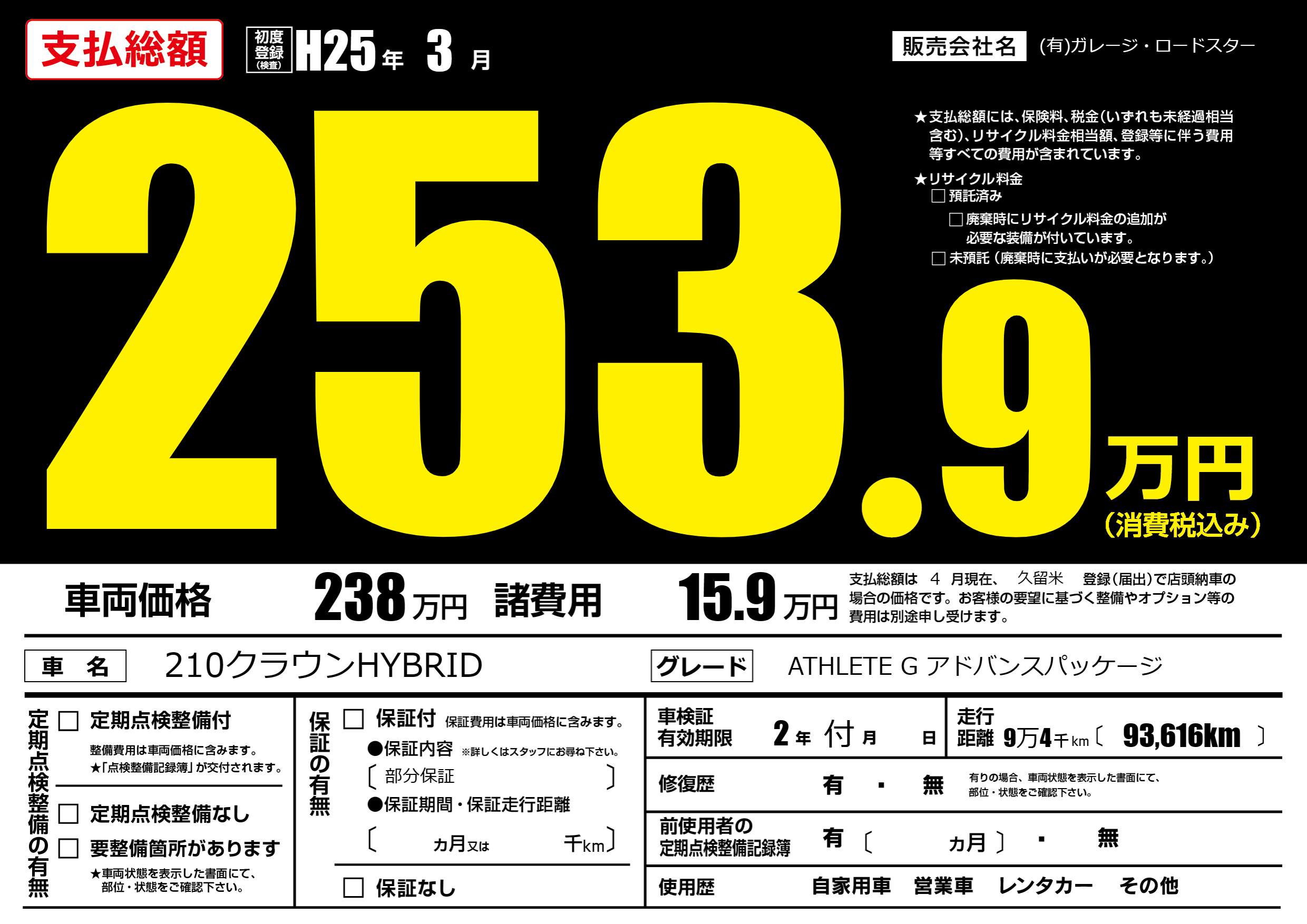 | 車名 | 210クラウンHYBRID | グレード ミッション 排気量 |