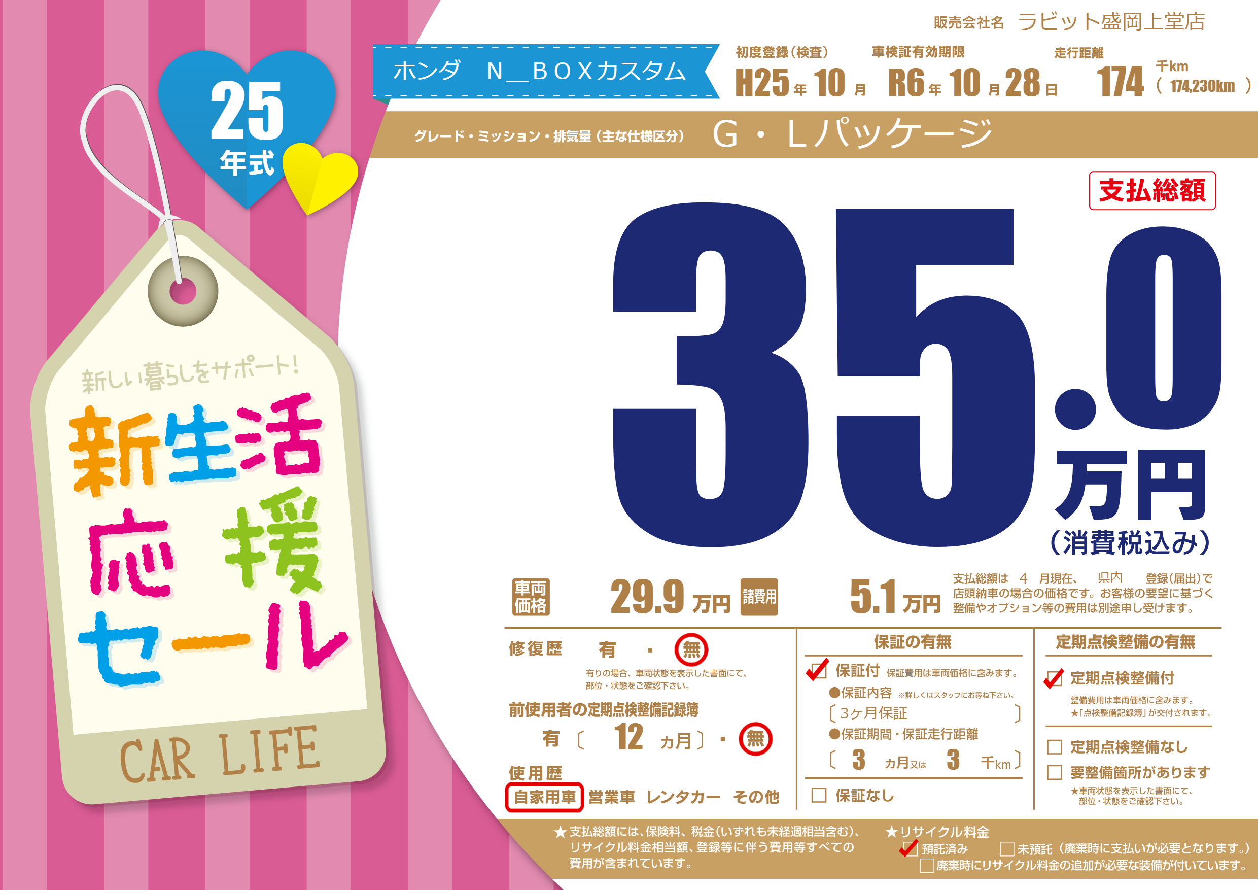 | 走行キロ | 17.4万km | 初年度登録 | H25年10月 |