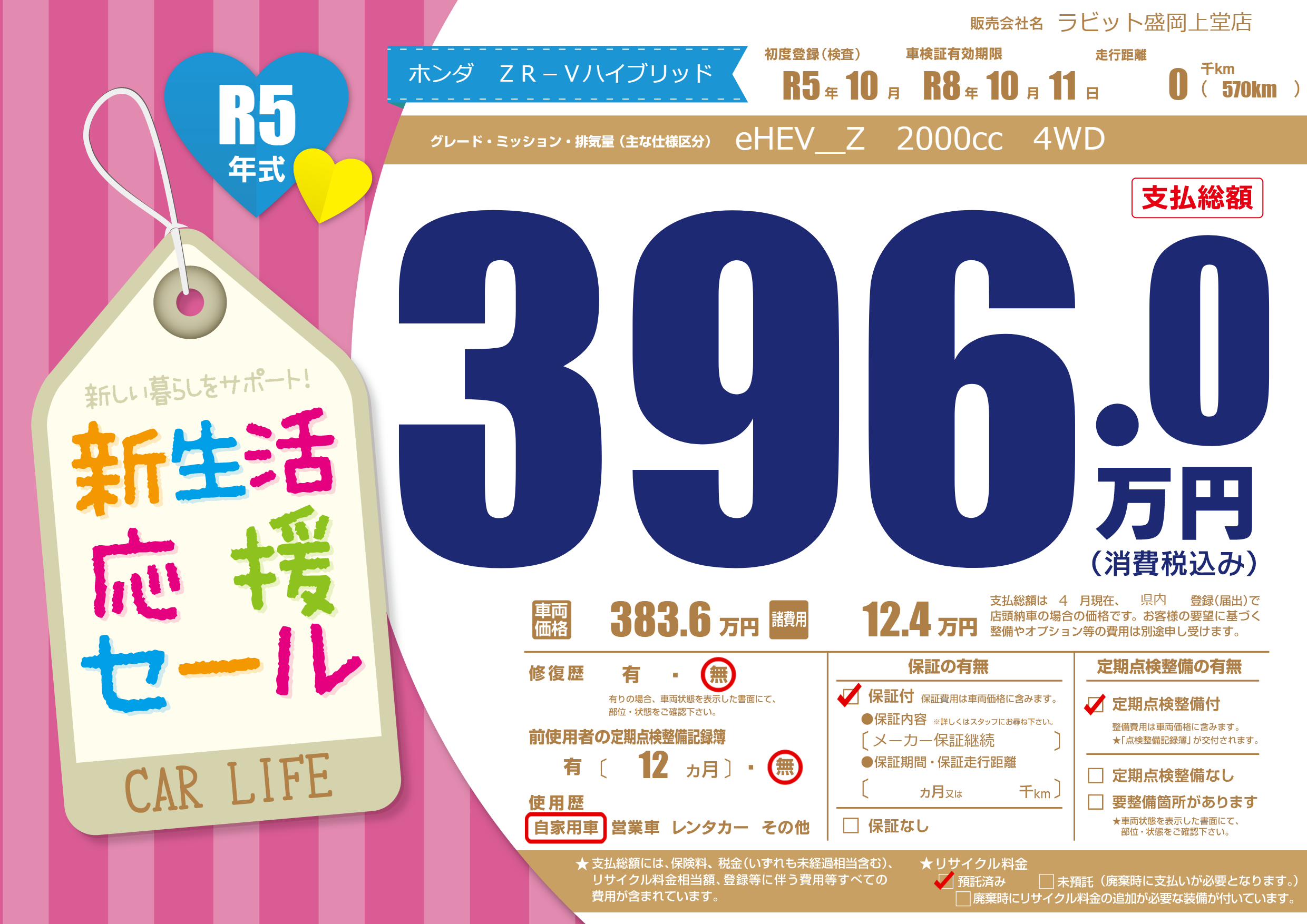 | 車名 | ホンダ ZR-Vハイブリッド | グレード ミッション 排気量 |