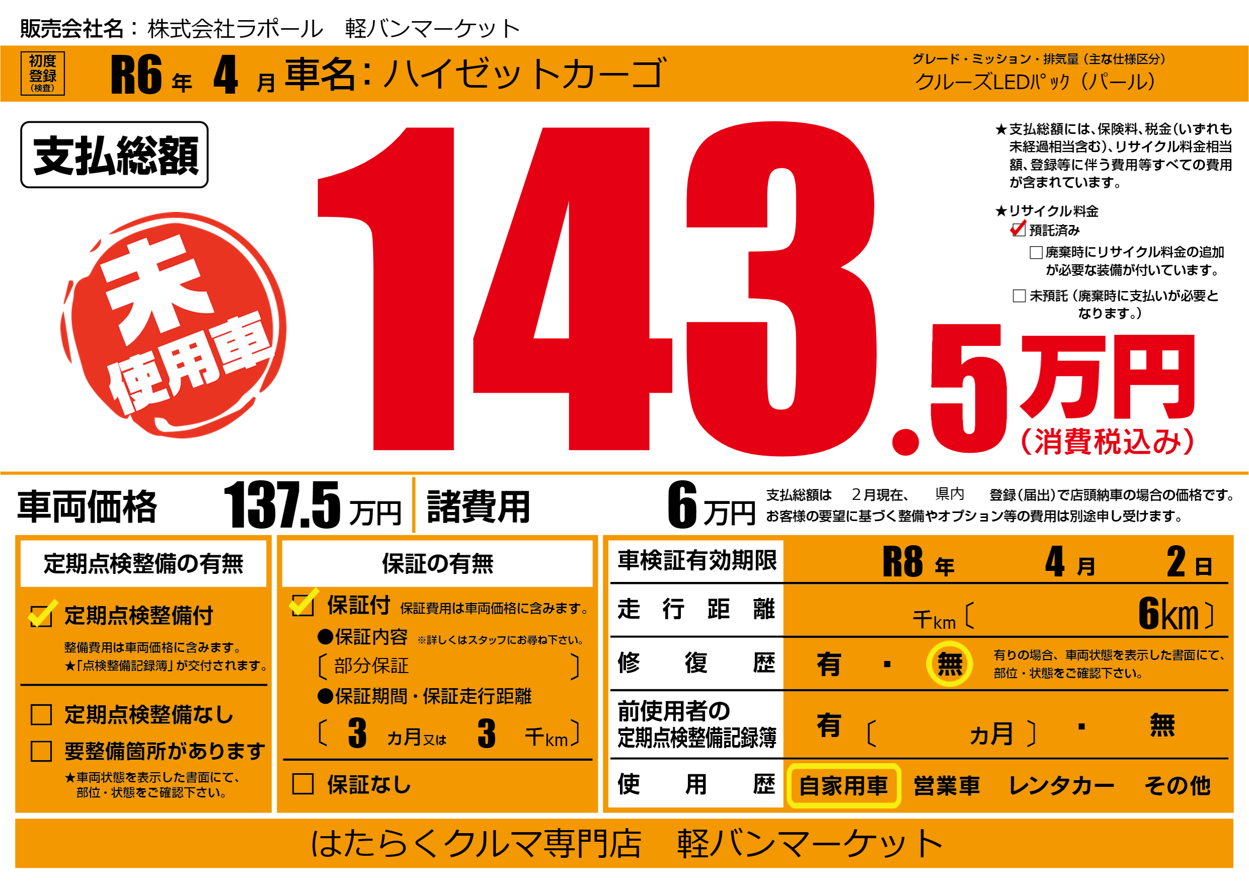 | 車名 | ハイゼットカーゴ | グレード ミッション 排気量 |