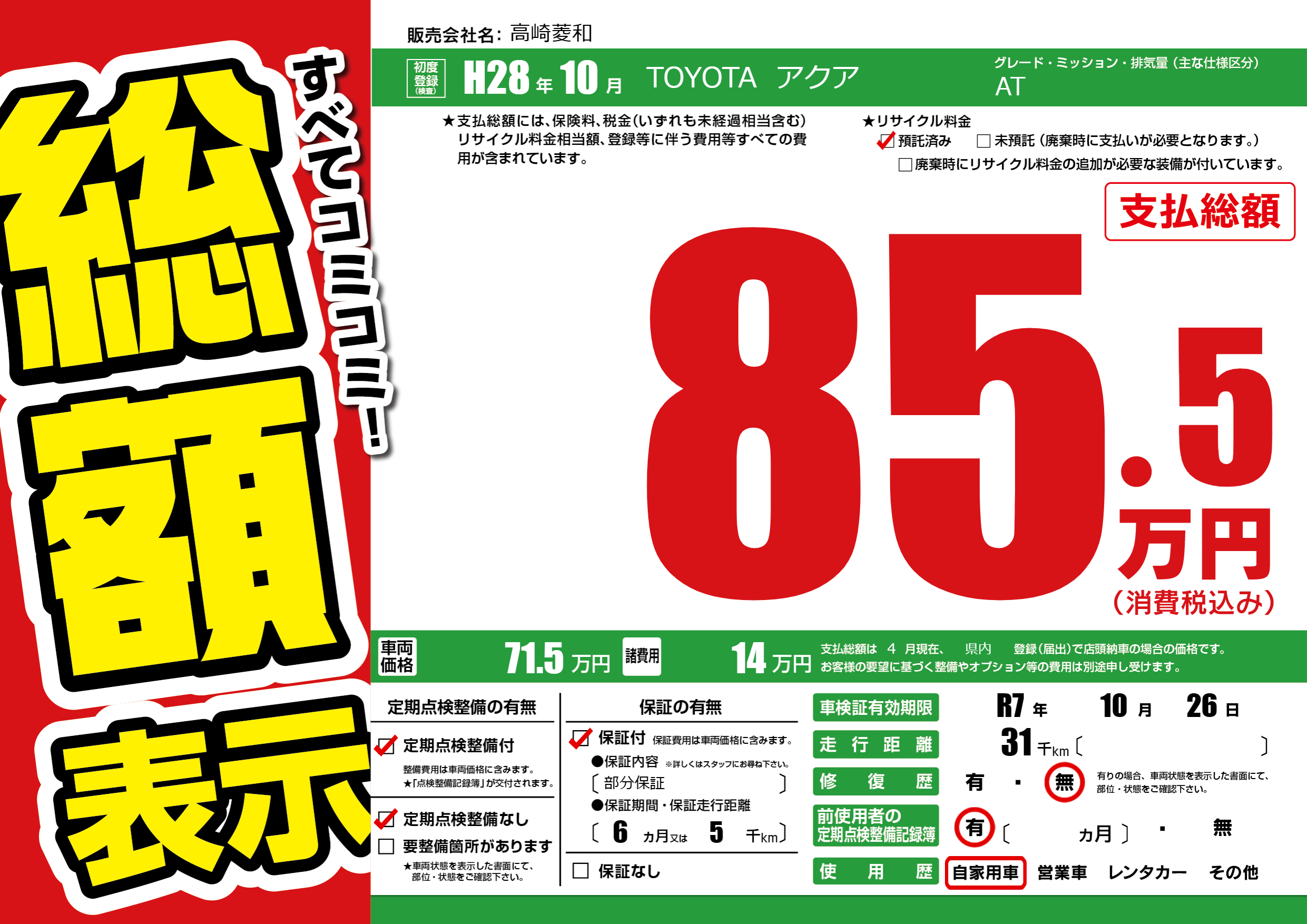 | 車名 | TOYOTA アクア | グレード ミッション 排気量 |