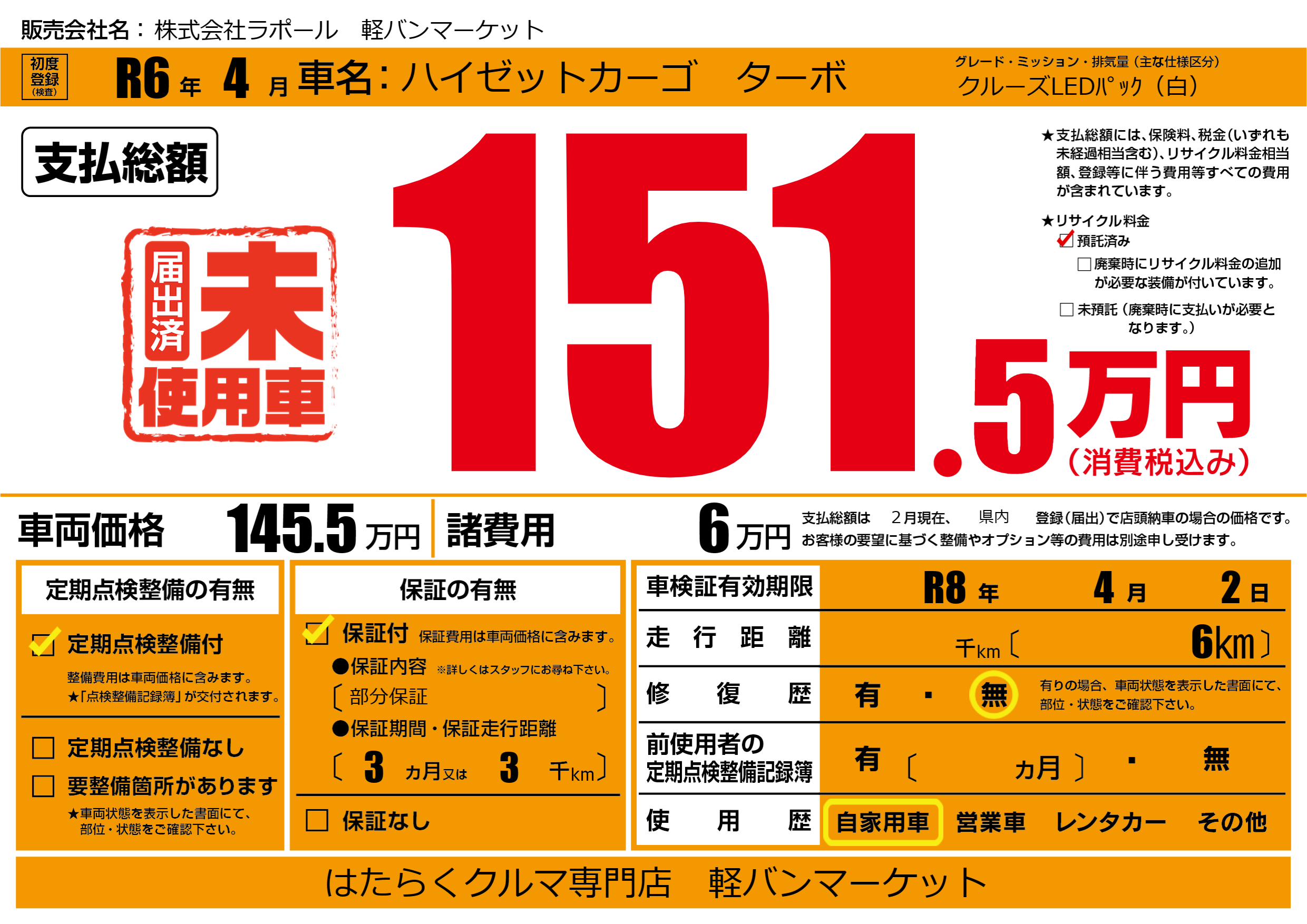 | 車名 | ハイゼットカーゴ ターボ | グレード ミッション 排気量 |