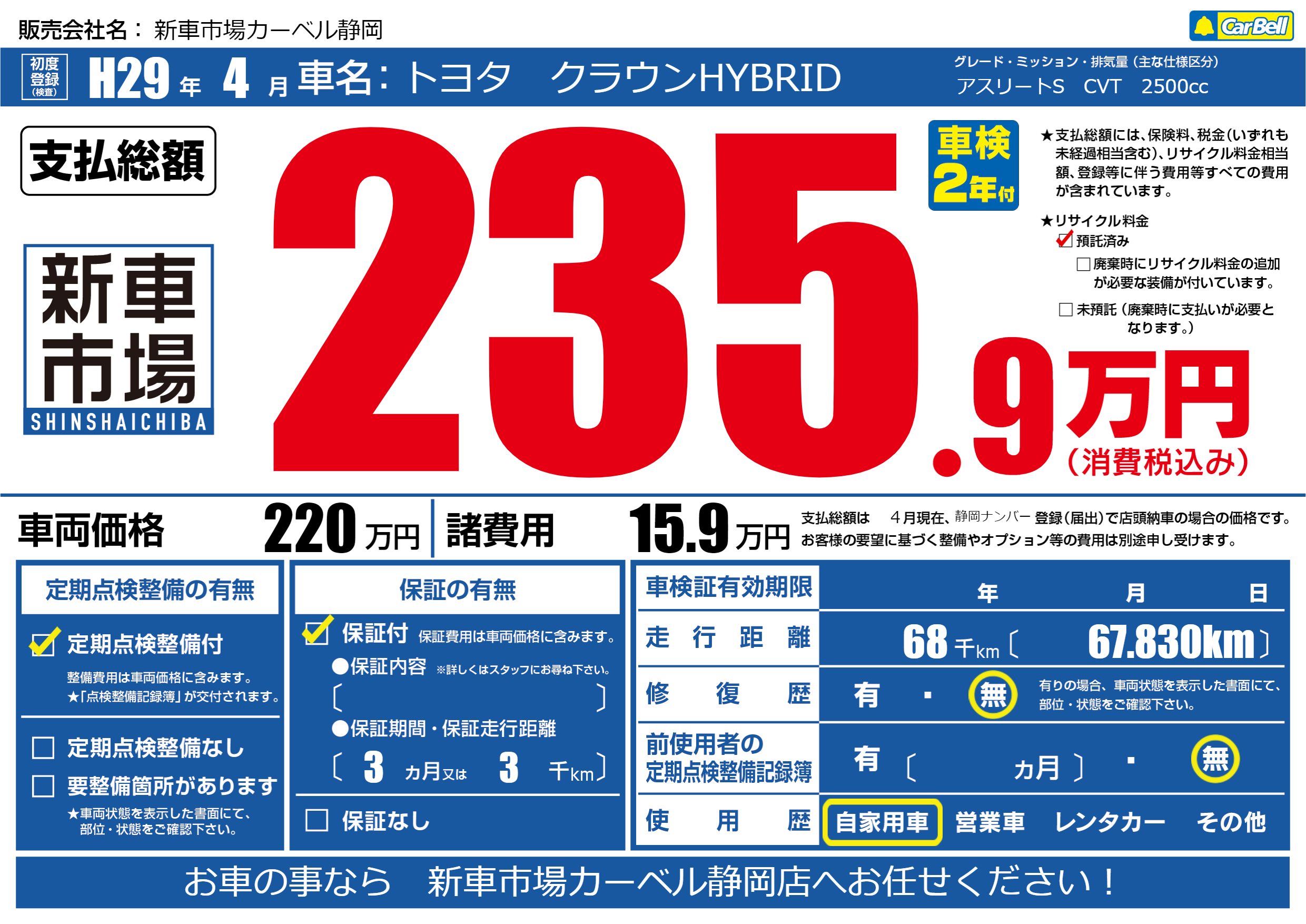 | 車名 | トヨタ クラウンHYBRID | グレード ミッション 排気量 |