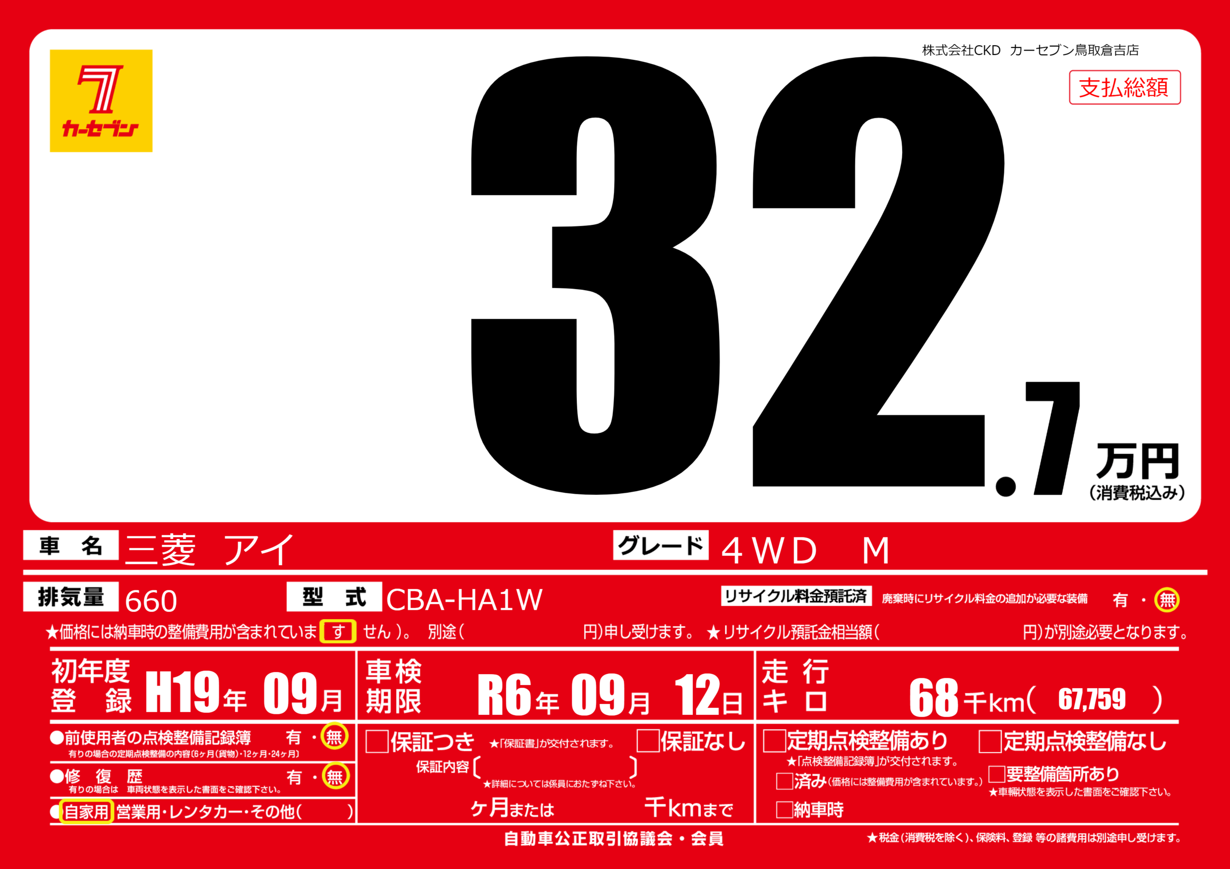 | 車名 | 三菱 アイ | グレード ミッション 排気量 |