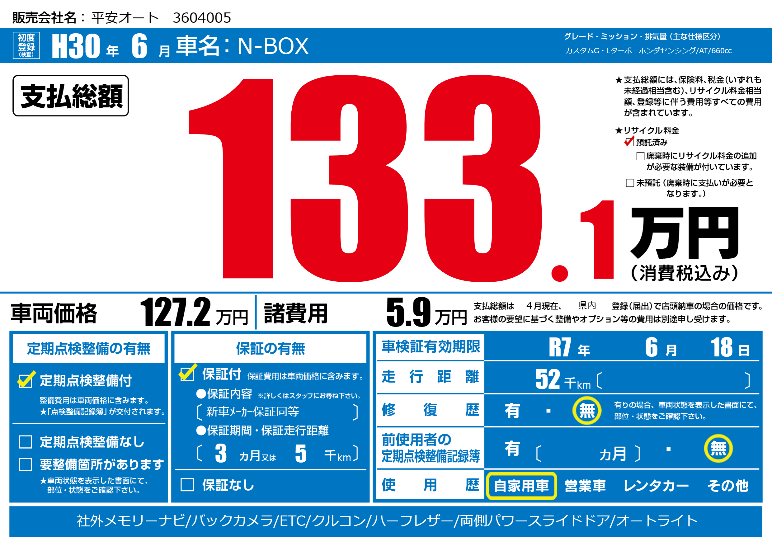 | 車名 | N-BOX | グレード ミッション 排気量 |