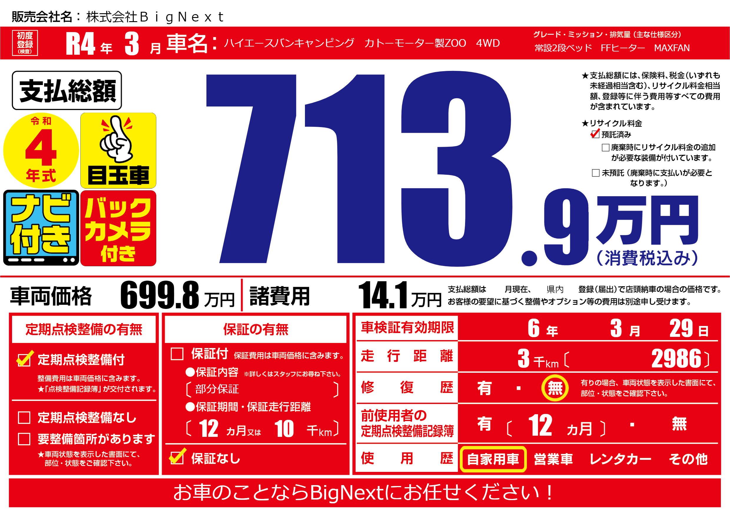 | 車名 | ハイエースバンキャンピング カトーモーター製ZOO 4WD | グレード ミッション 排気量 |