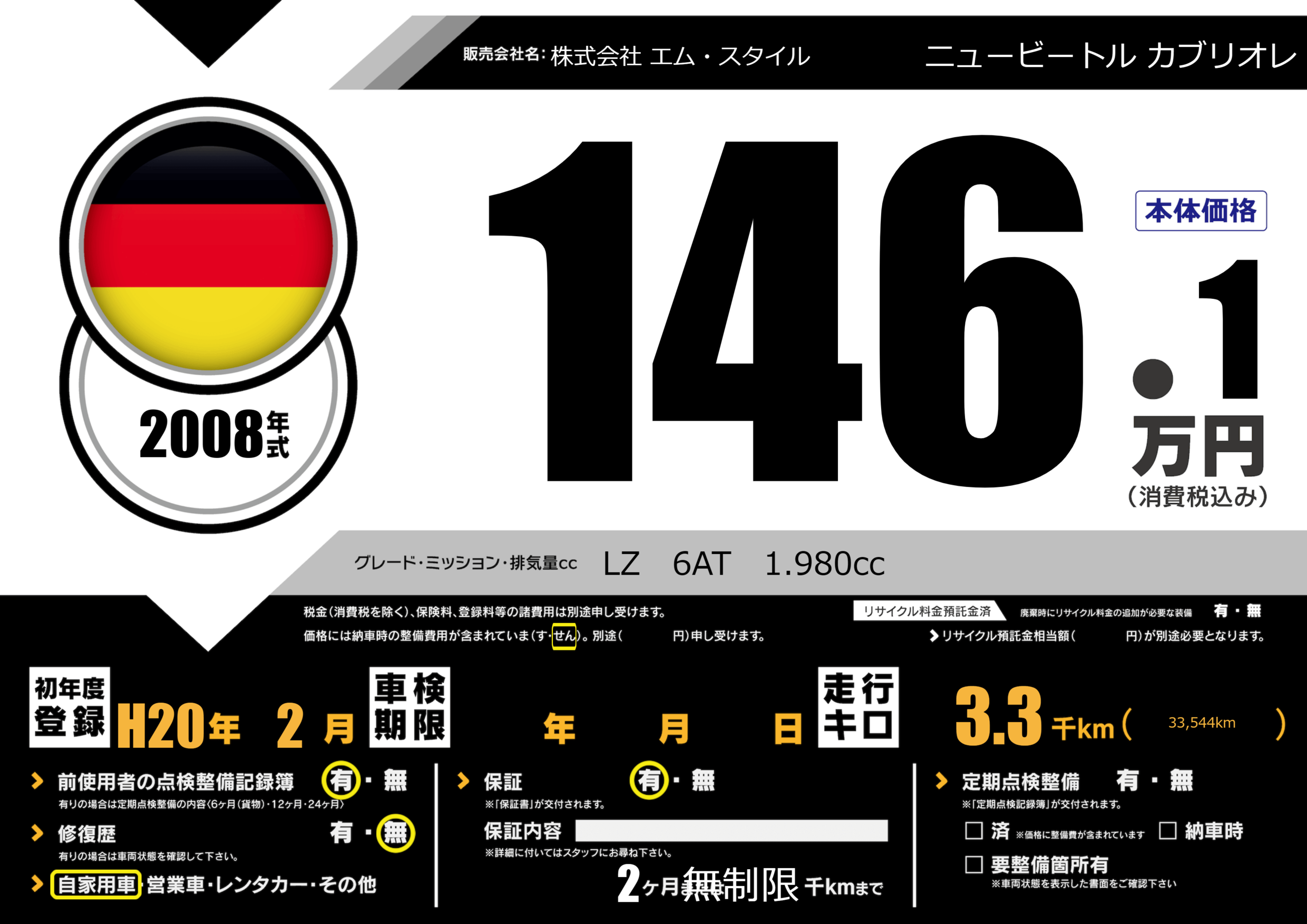 | 車名 | ニュービートル カブリオレ | グレード ミッション 排気量 |