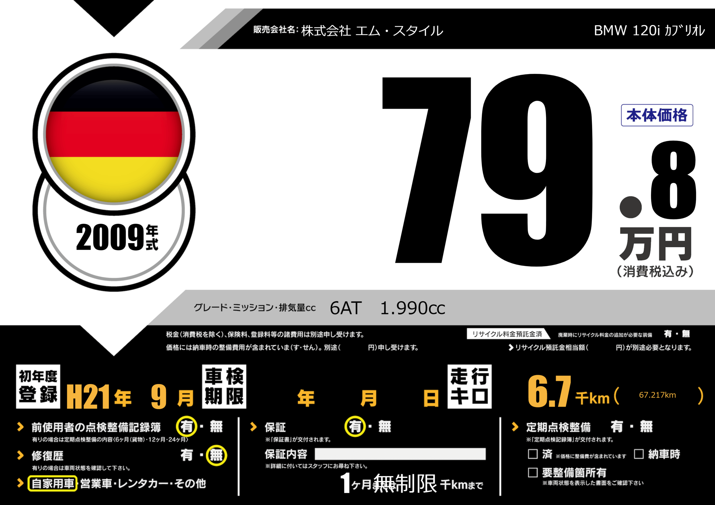 | 車名 | BMW 120i カブリオレ | グレード ミッション 排気量 |