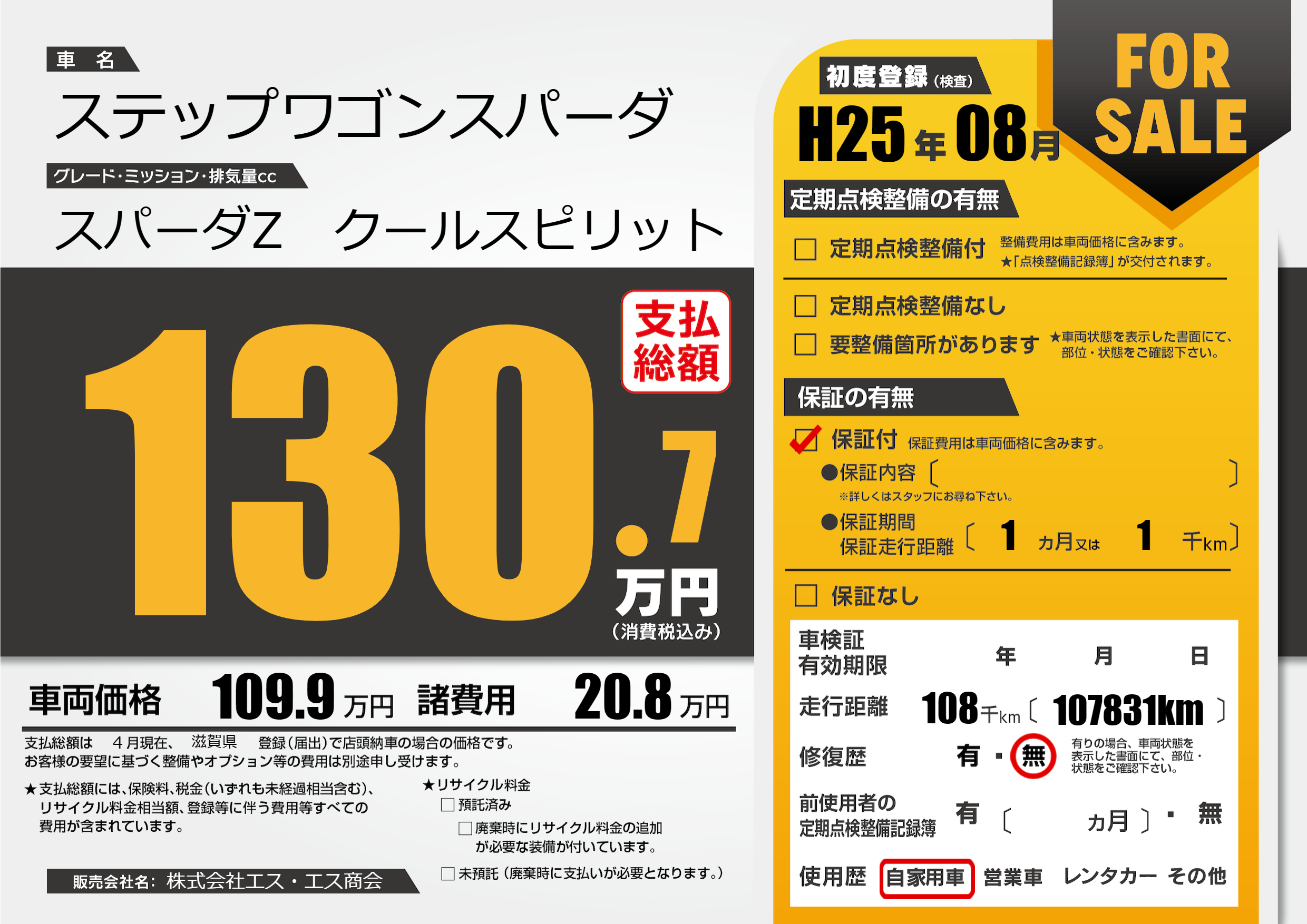 | 走行キロ | 10.8万km | 初年度登録 | H25年08月 |