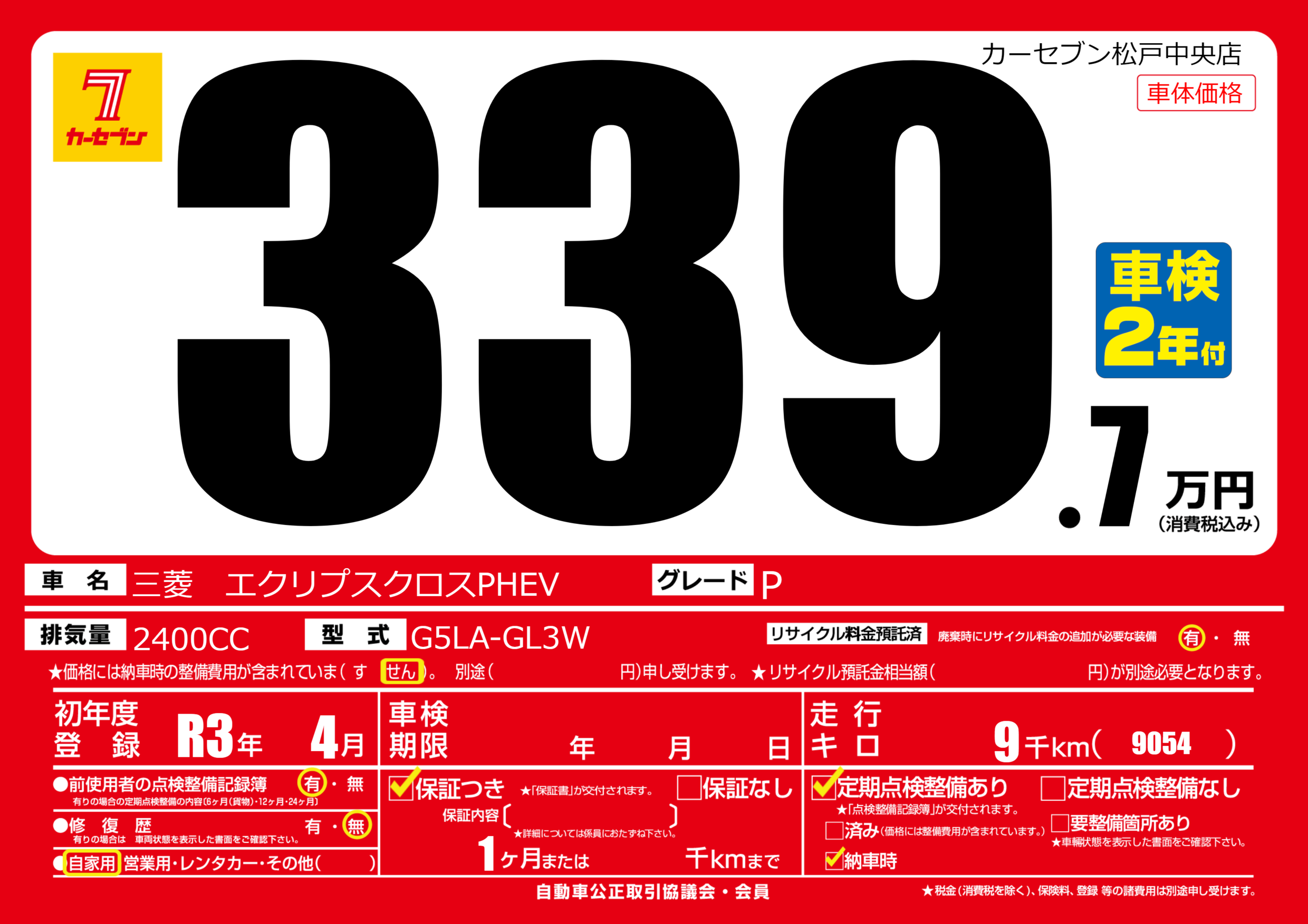 | 車名 | 三菱 エクリプスクロスPHEV | グレード ミッション 排気量 |