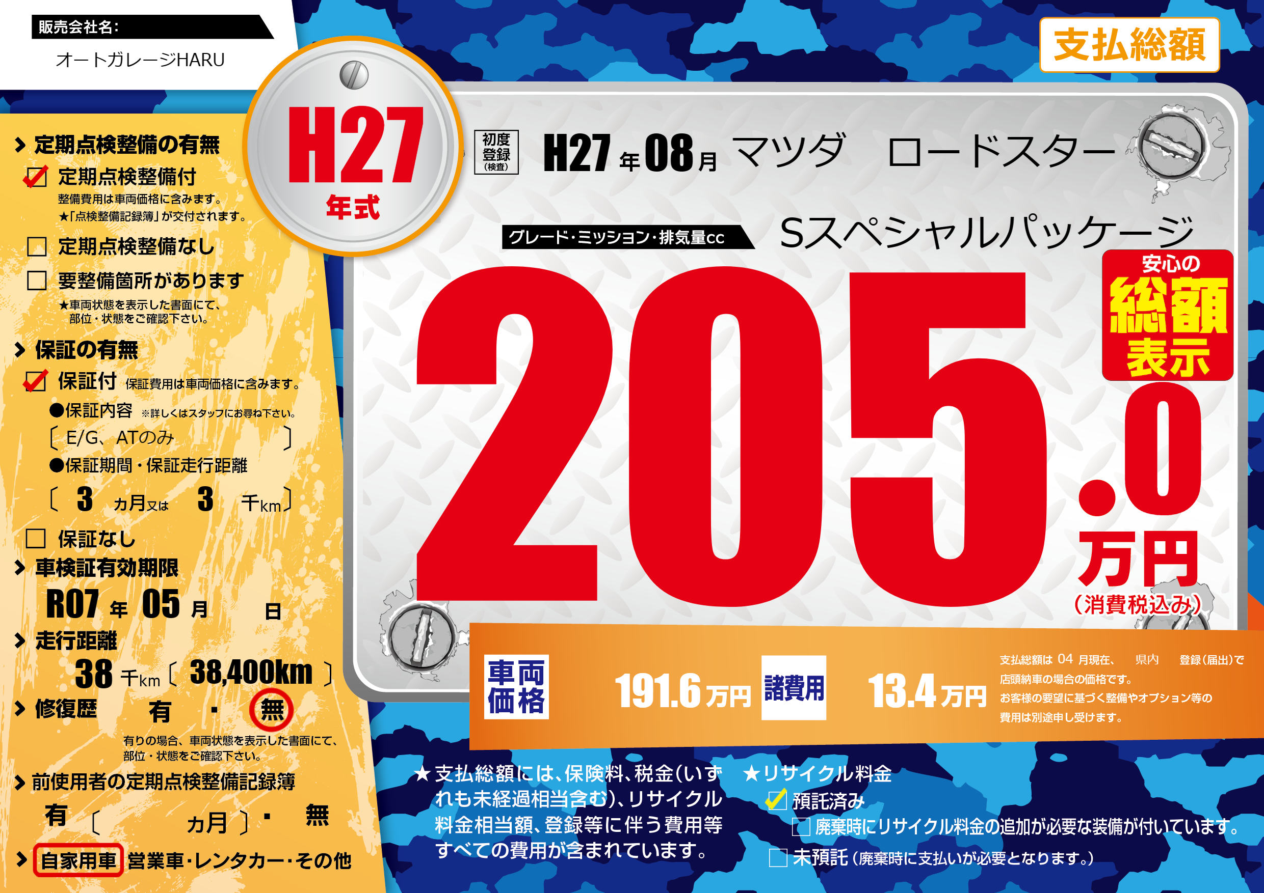 | 走行キロ | 3.8万km | 初年度登録 | H27年08月 |