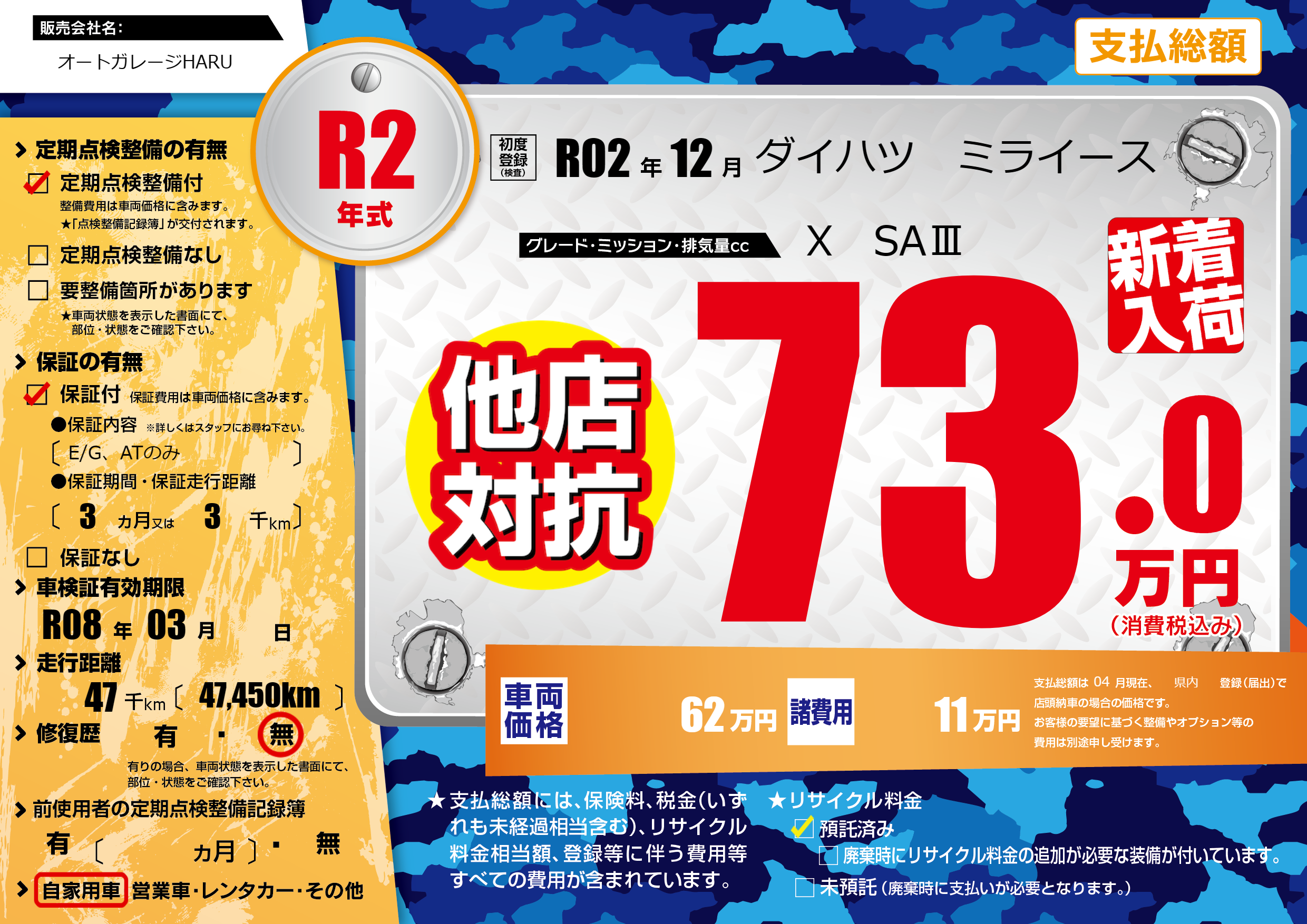 | 走行キロ | 4.7万km | 初年度登録 | R02年12月 |