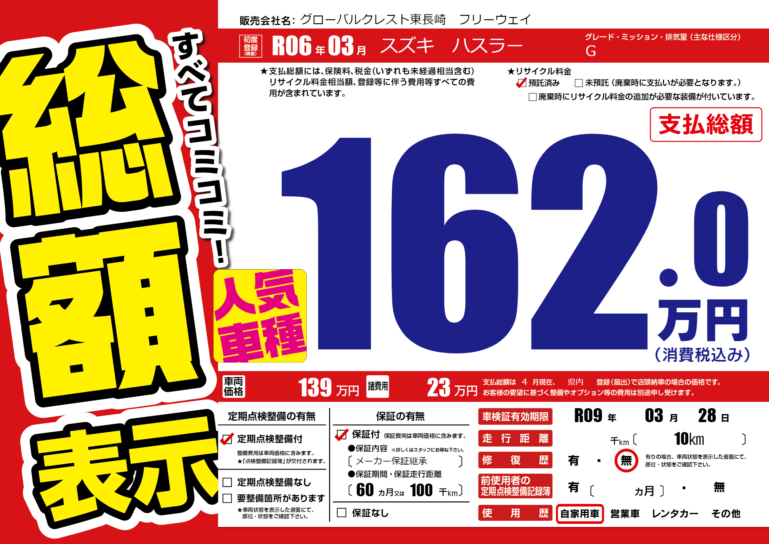 | 車名 | スズキ ハスラー | グレード ミッション 排気量 |