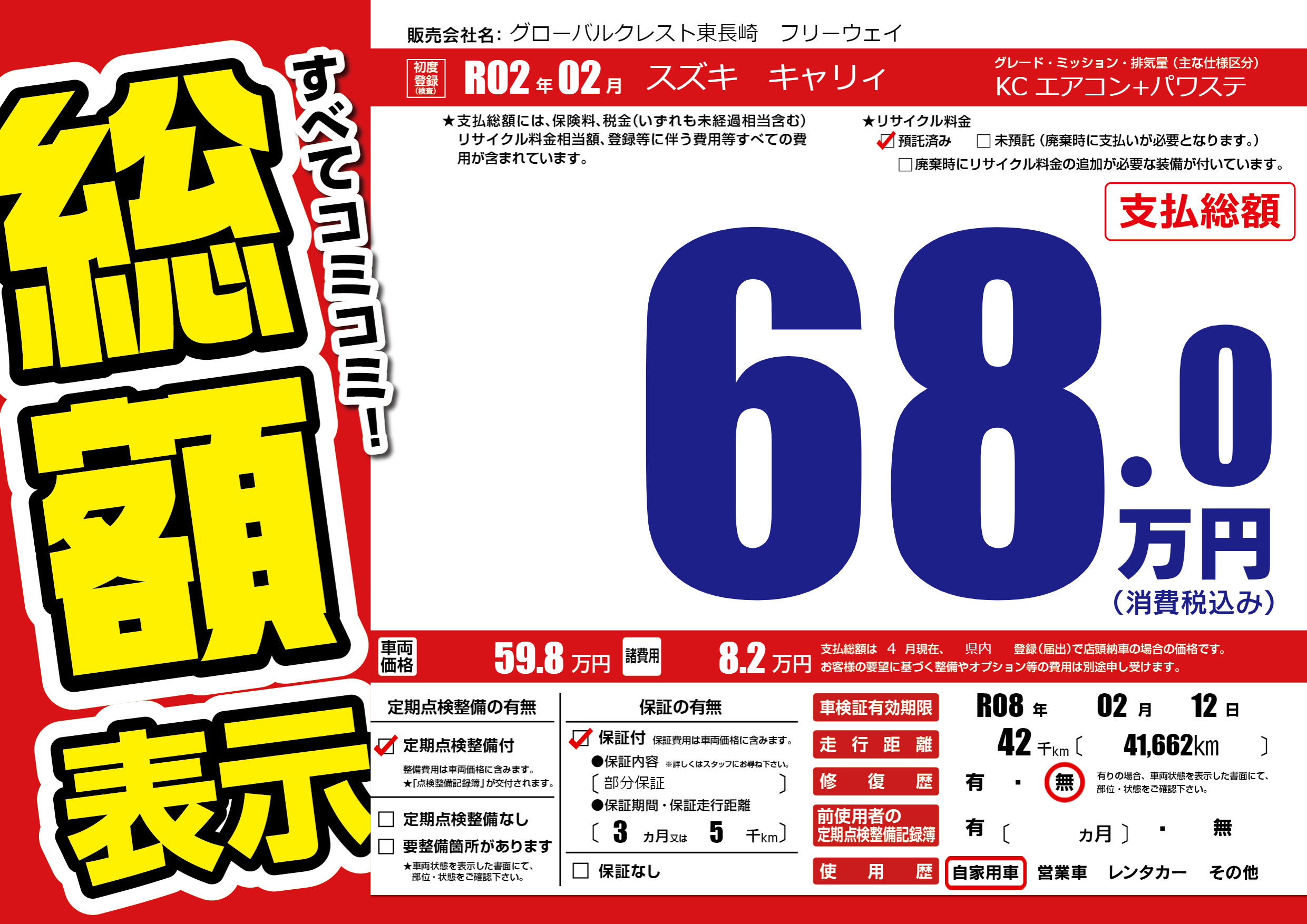 | 車名 | スズキ キャリィ | グレード ミッション 排気量 |