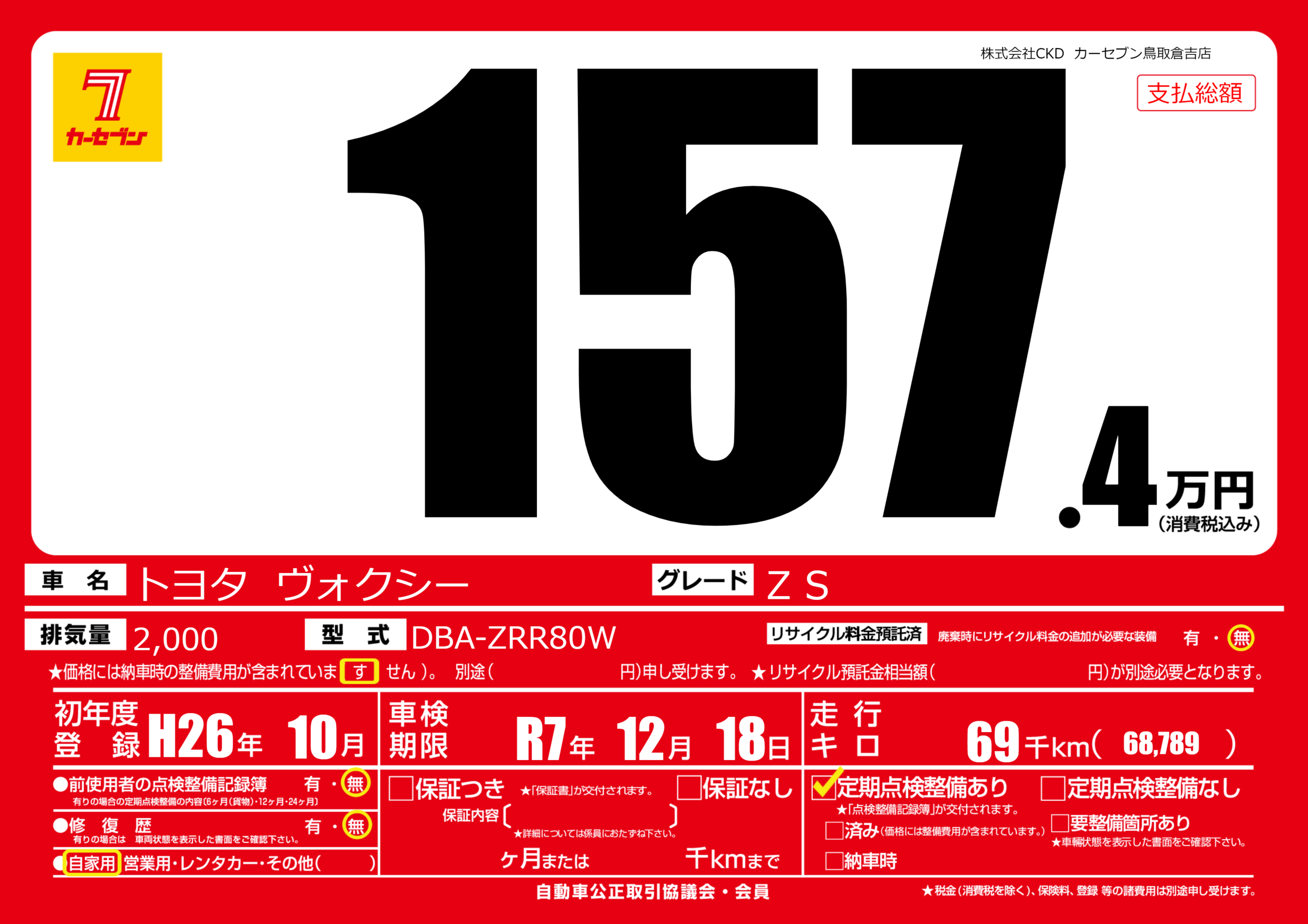 | 走行キロ | 6.9万km | 初年度登録 | H26年10月 |
