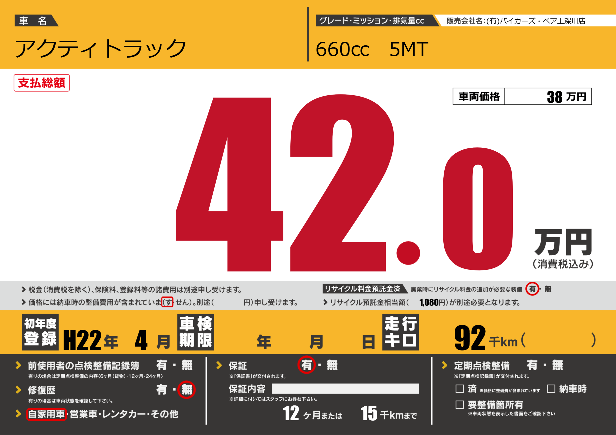 保証なし 保証内容(---) 12ヶ月または(15)千kmまで |