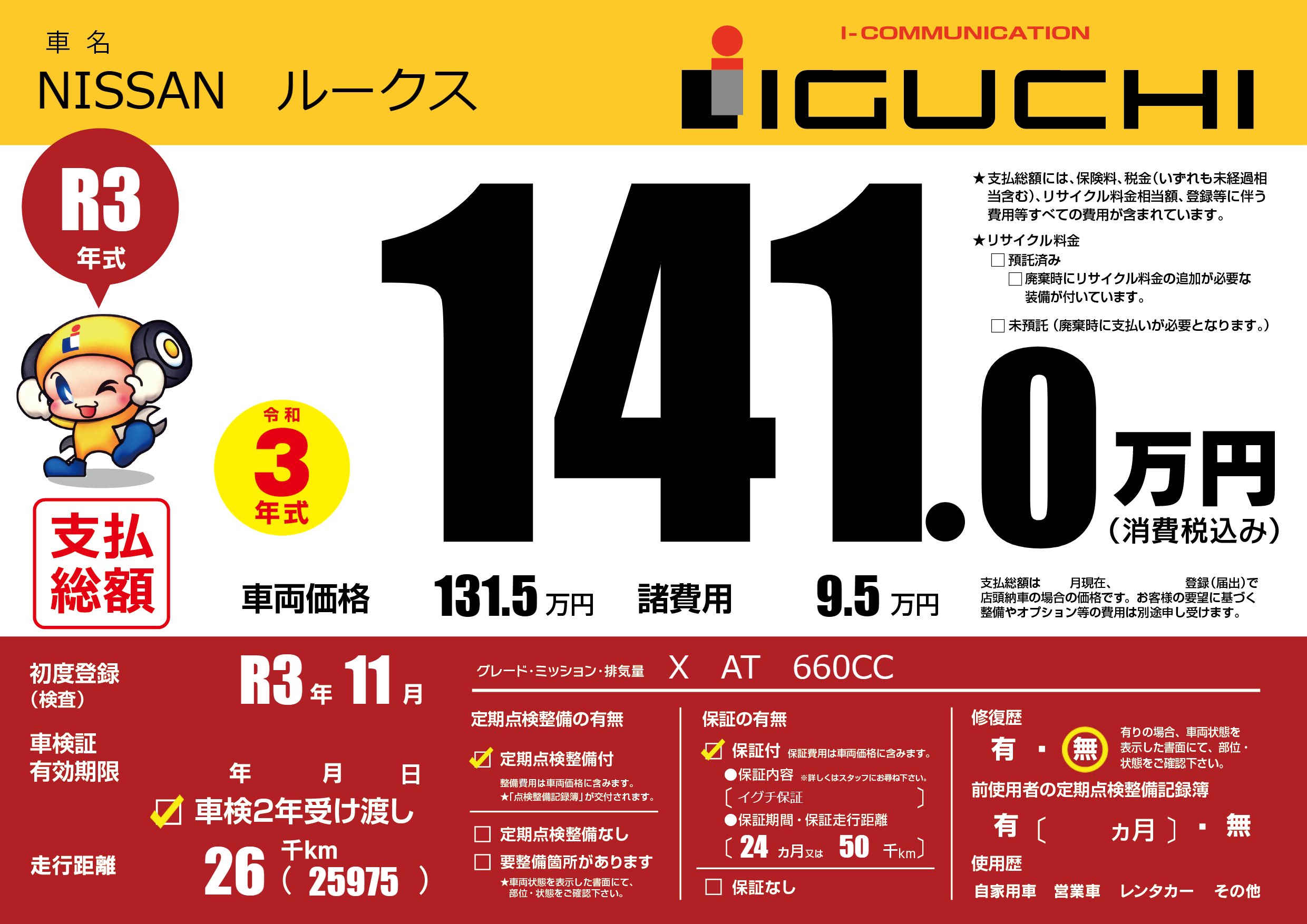 | 車名 | NISSAN ルークス | グレード ミッション 排気量 |
