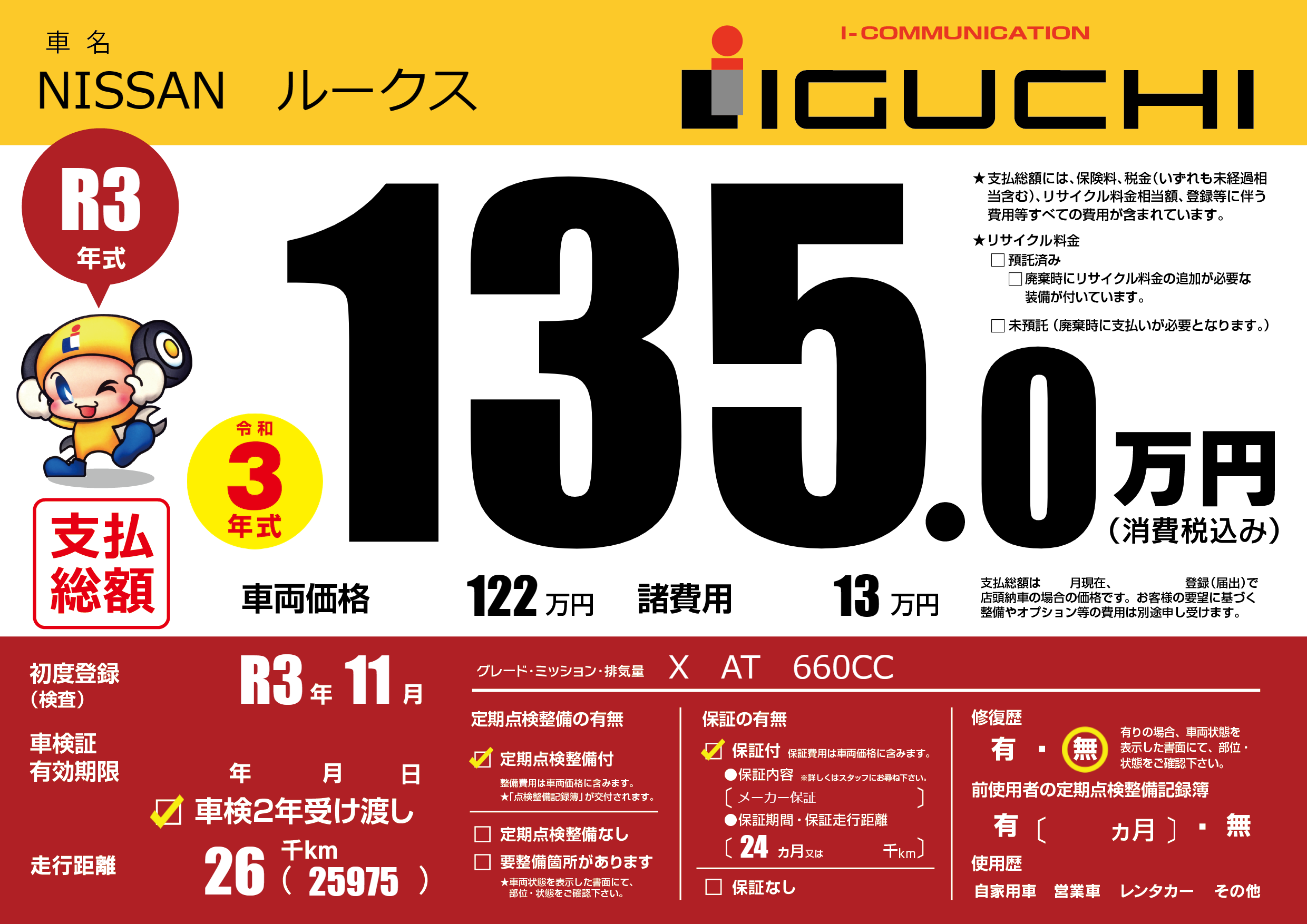| 車名 | NISSAN ルークス | グレード ミッション 排気量 |