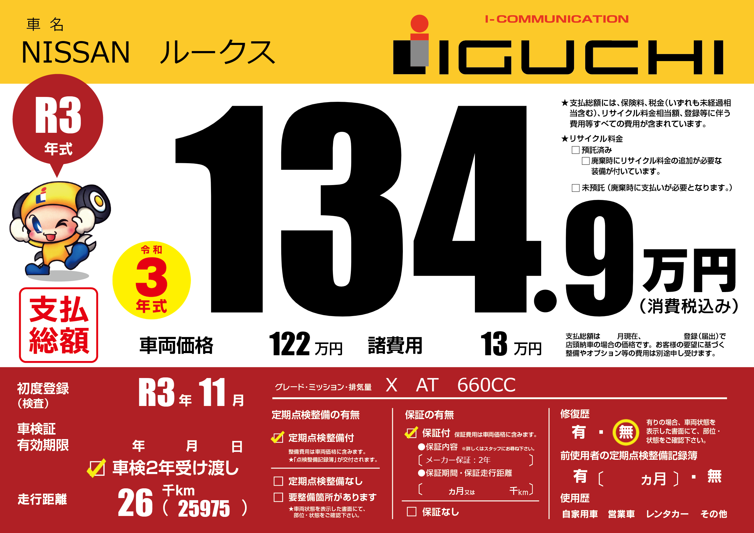 | 車名 | NISSAN ルークス | グレード ミッション 排気量 |