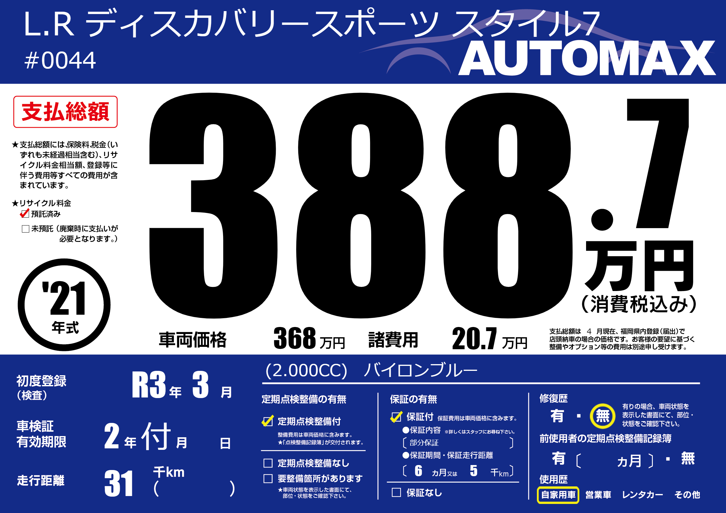 | 車名 | L.R ディスカバリースポーツ スタイル7 | グレード ミッション 排気量 |