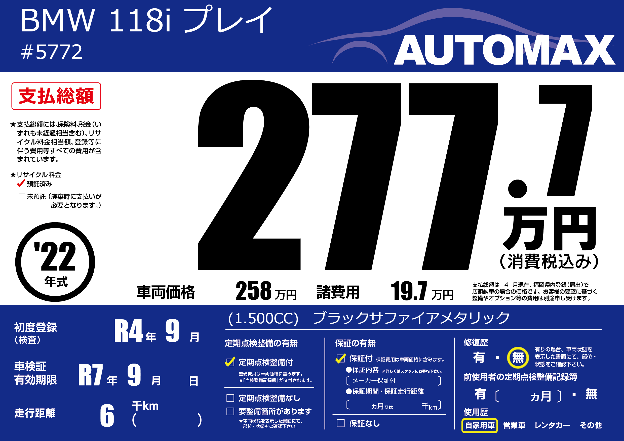| 車検制限 | R7年 9月 - 日 | ||