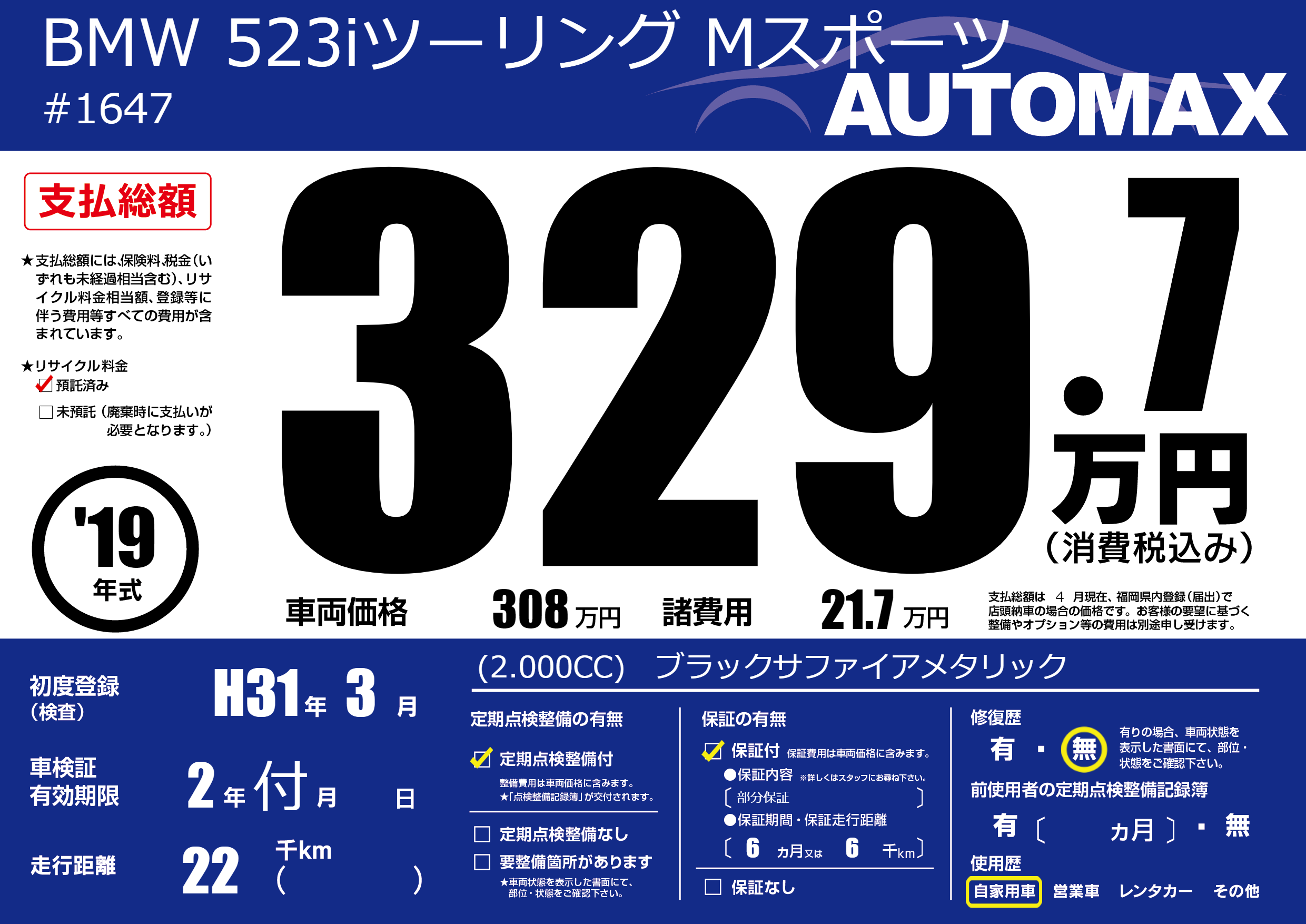 | 車名 | BMW 523iツーリング Mスポーツ | グレード ミッション 排気量 |