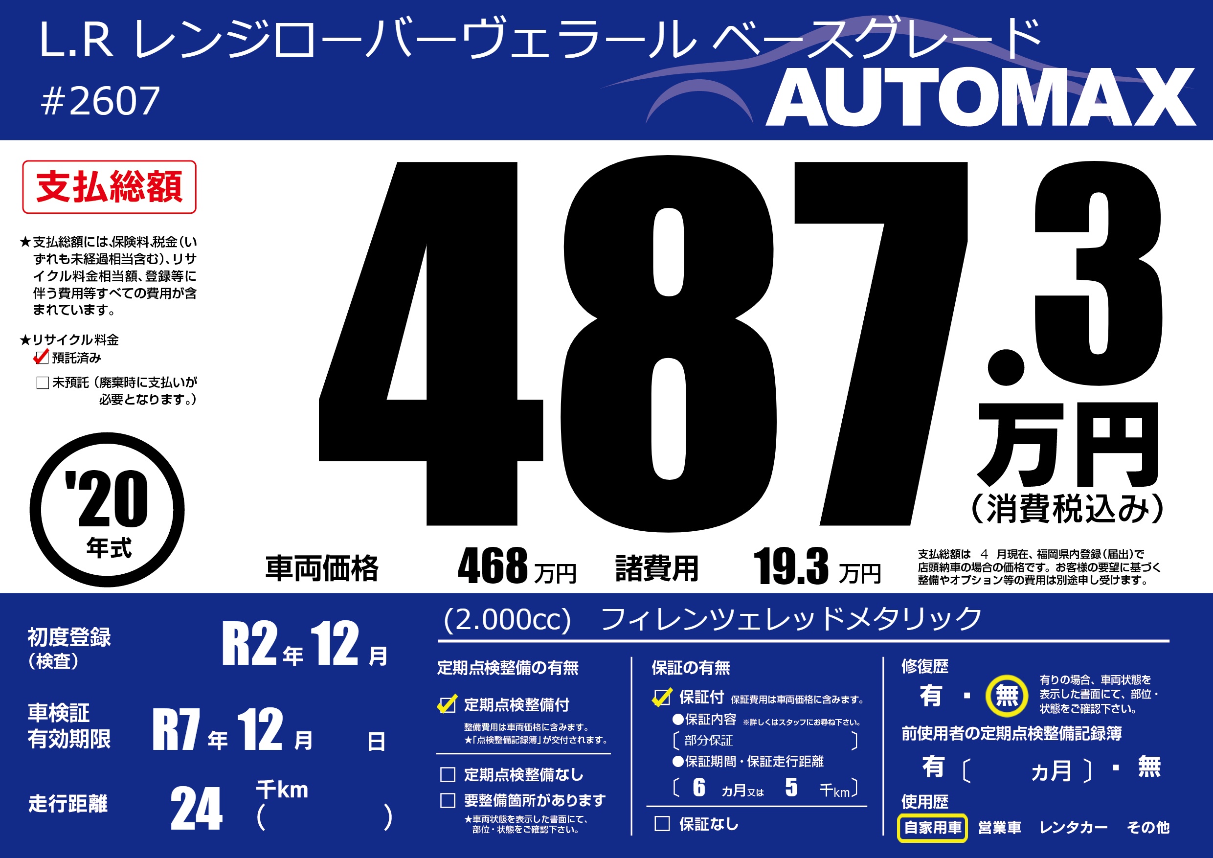 | 車名 | L.R レンジローバーヴェラール ベースグレード | グレード ミッション 排気量 |