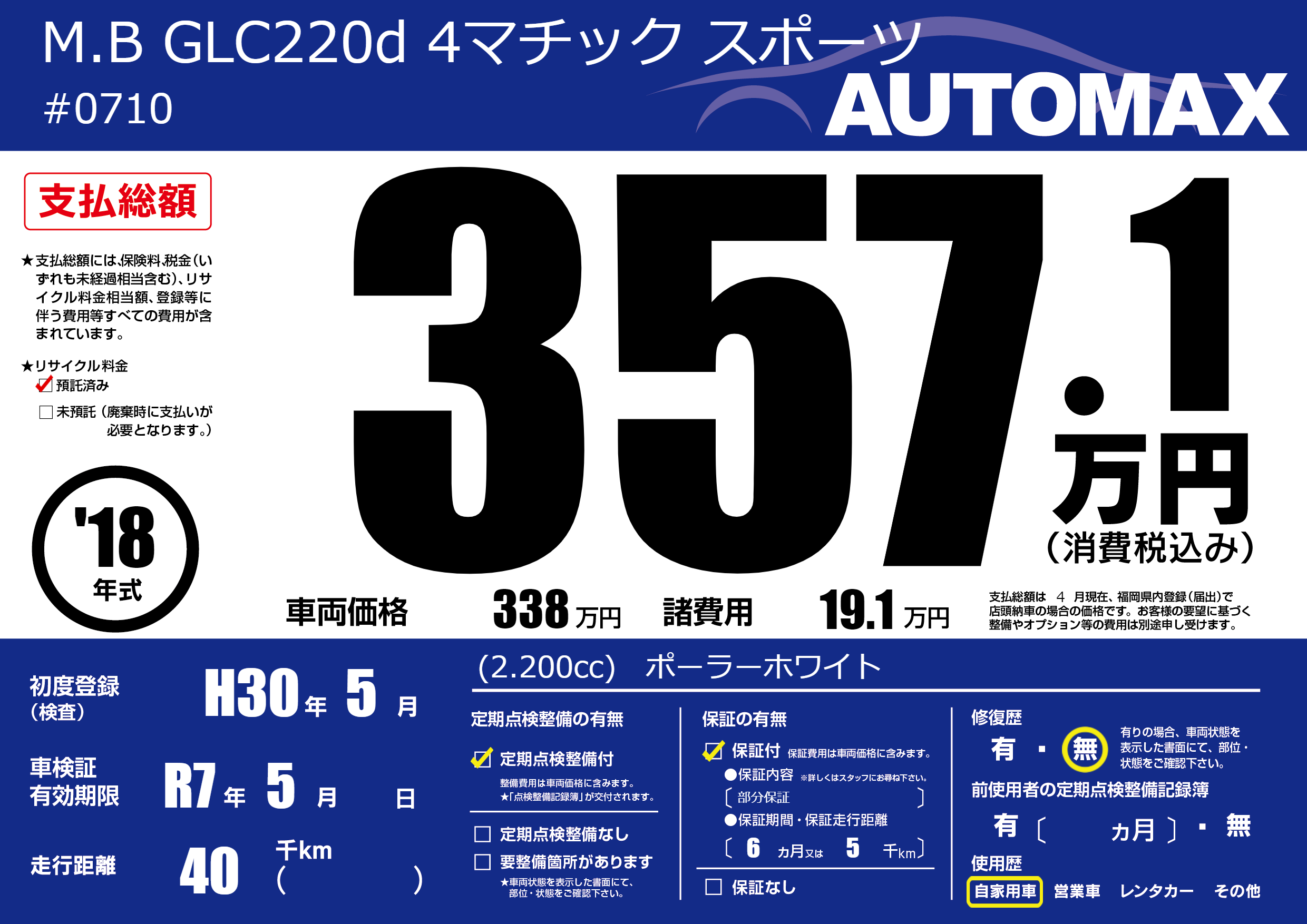 | 車名 | M.B GLC220d 4マチック スポーツ | グレード ミッション 排気量 |