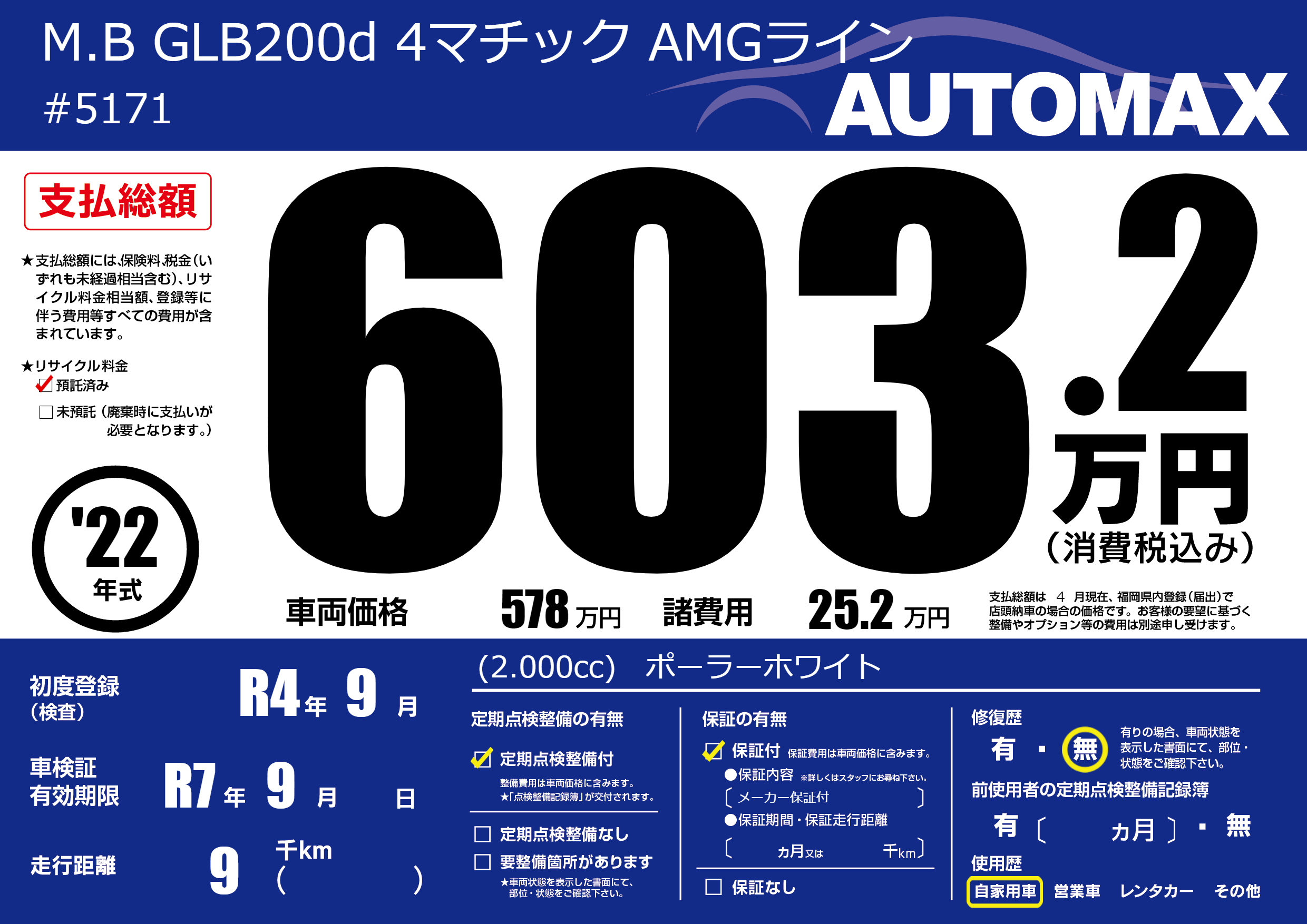 | 車名 | M.B GLB200d 4マチック AMGライン | グレード ミッション 排気量 |
