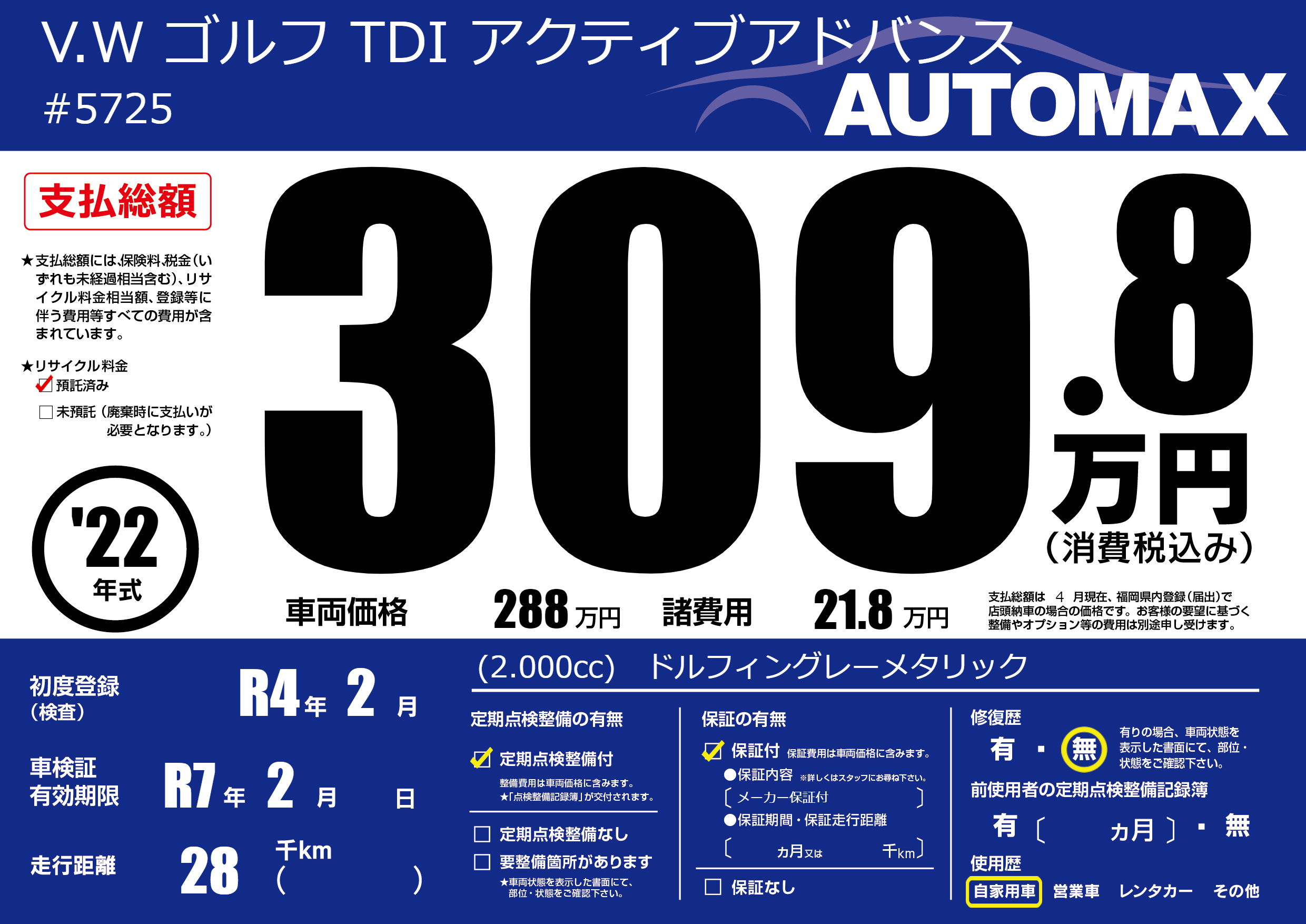 | 車名 | V.W ゴルフ TDI アクティブアドバンス | グレード ミッション 排気量 |