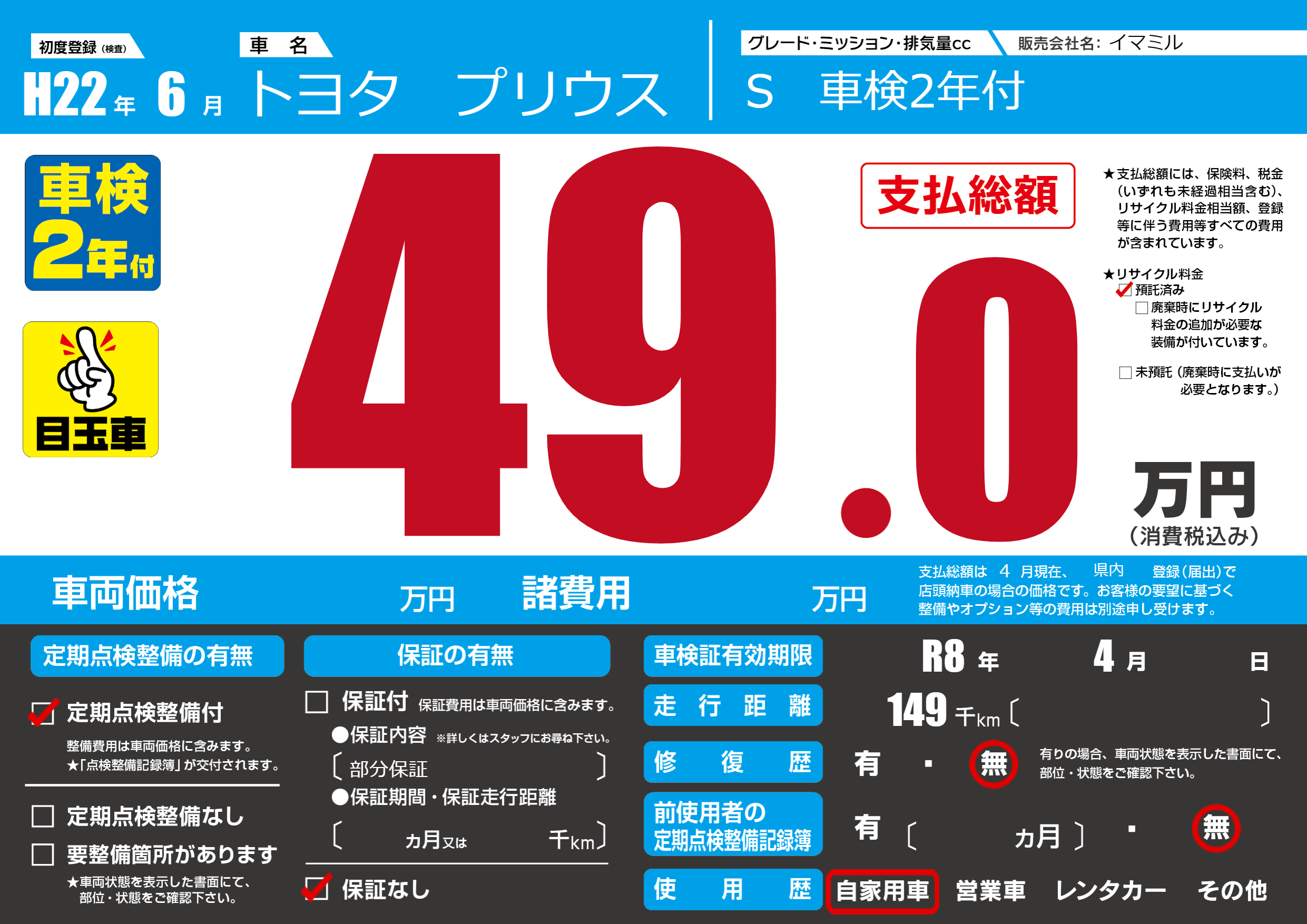 | 走行キロ | 14.9万km | 初年度登録 | H22年6月 |