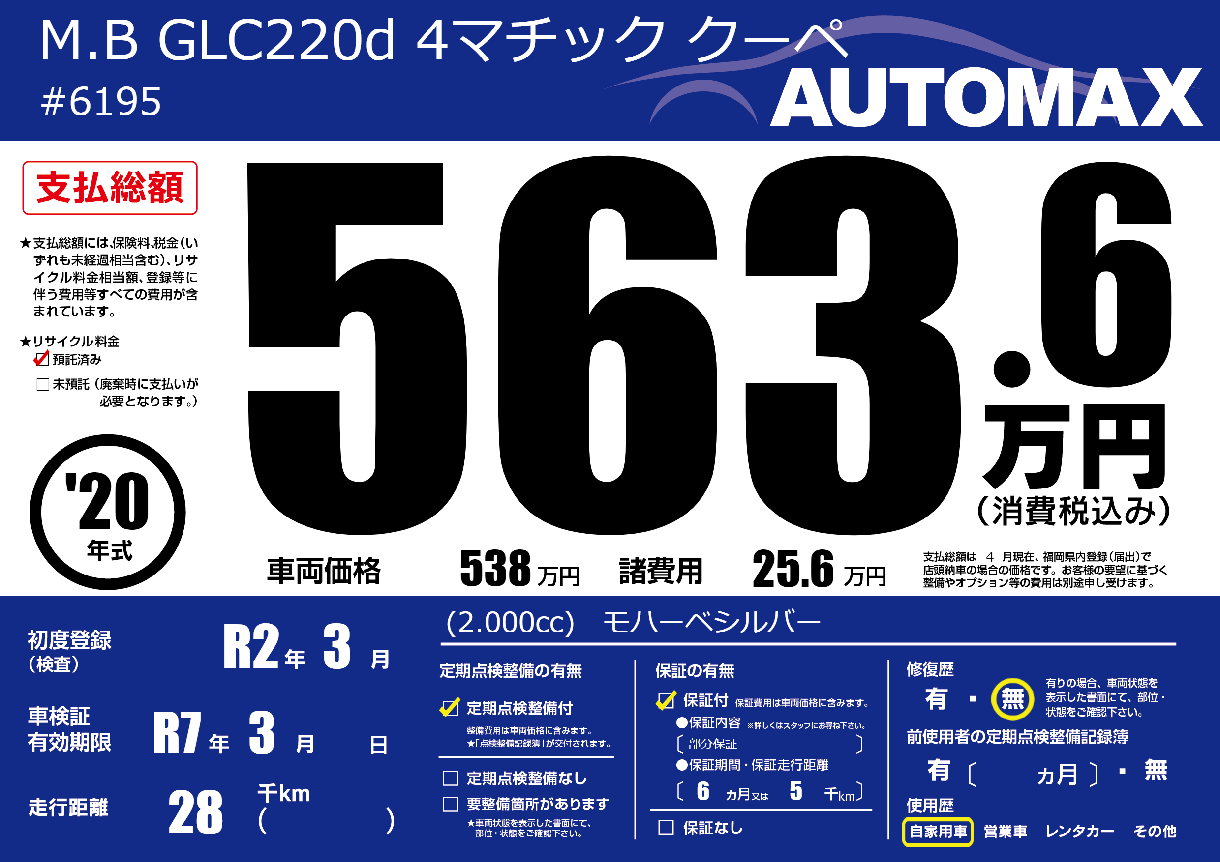| 車名 | M.B GLC220d 4マチック クーペ | グレード ミッション 排気量 |