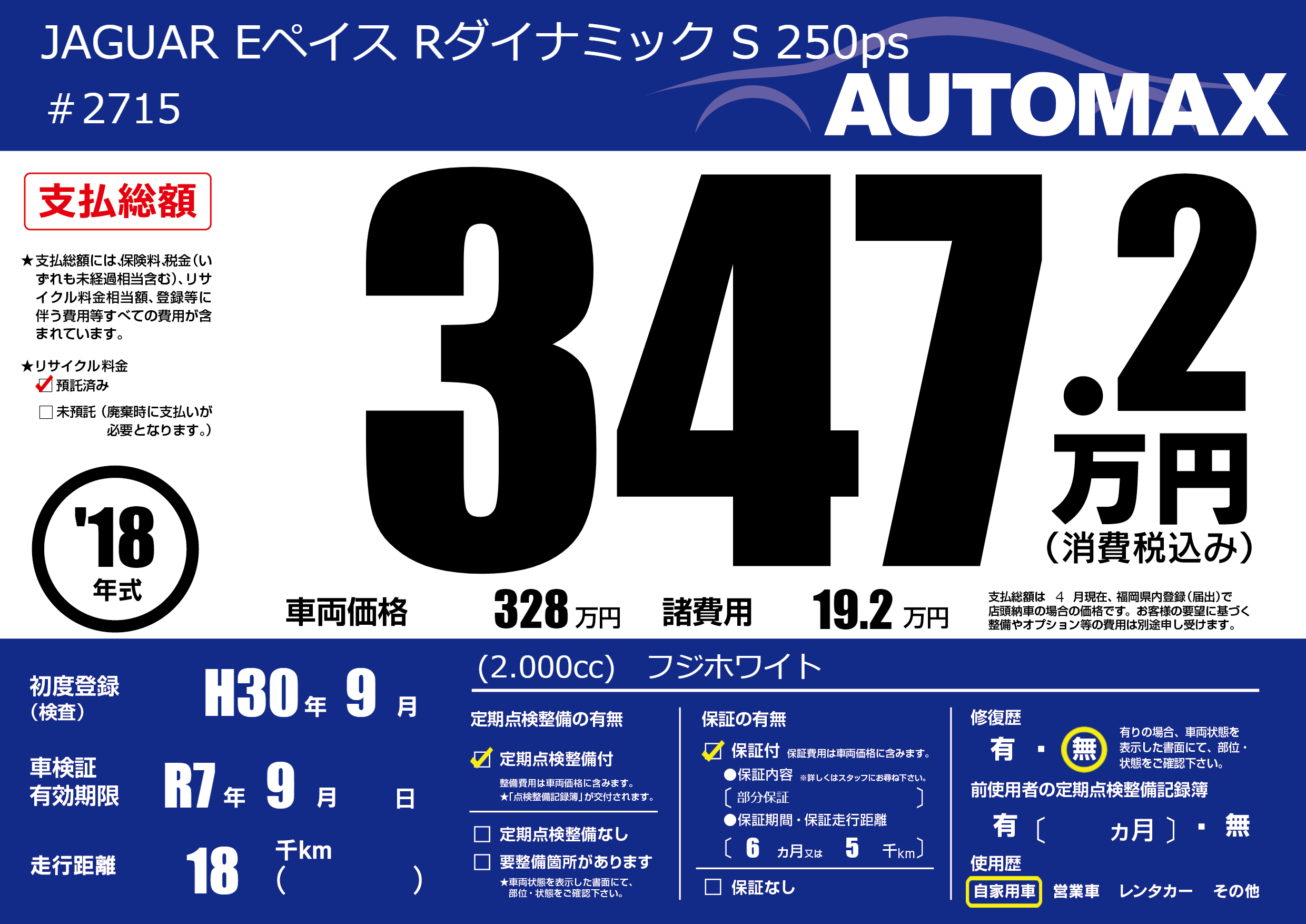 | 車名 | JAGUAR Eペイス Rダイナミック S 250ps | グレード ミッション 排気量 |