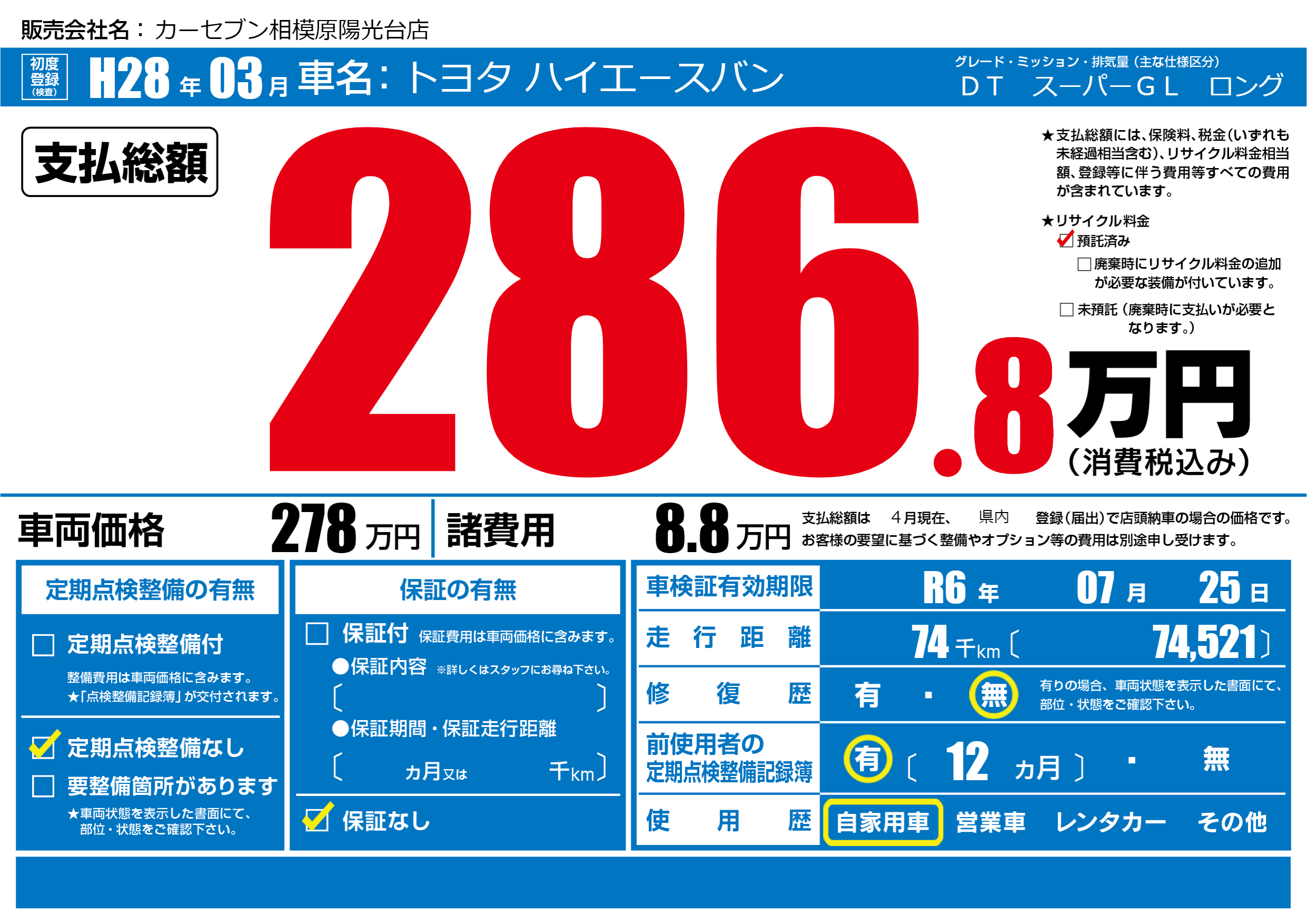 | 車名 | トヨタ ハイエースバン | グレード ミッション 排気量 |