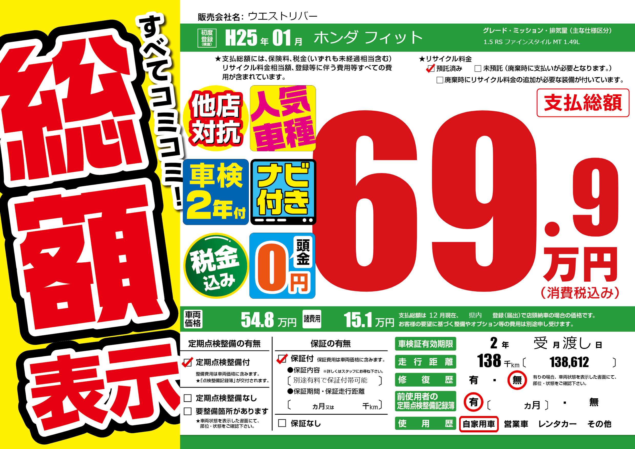 | 走行キロ | 13.8万km | 初年度登録 | H25年01月 |