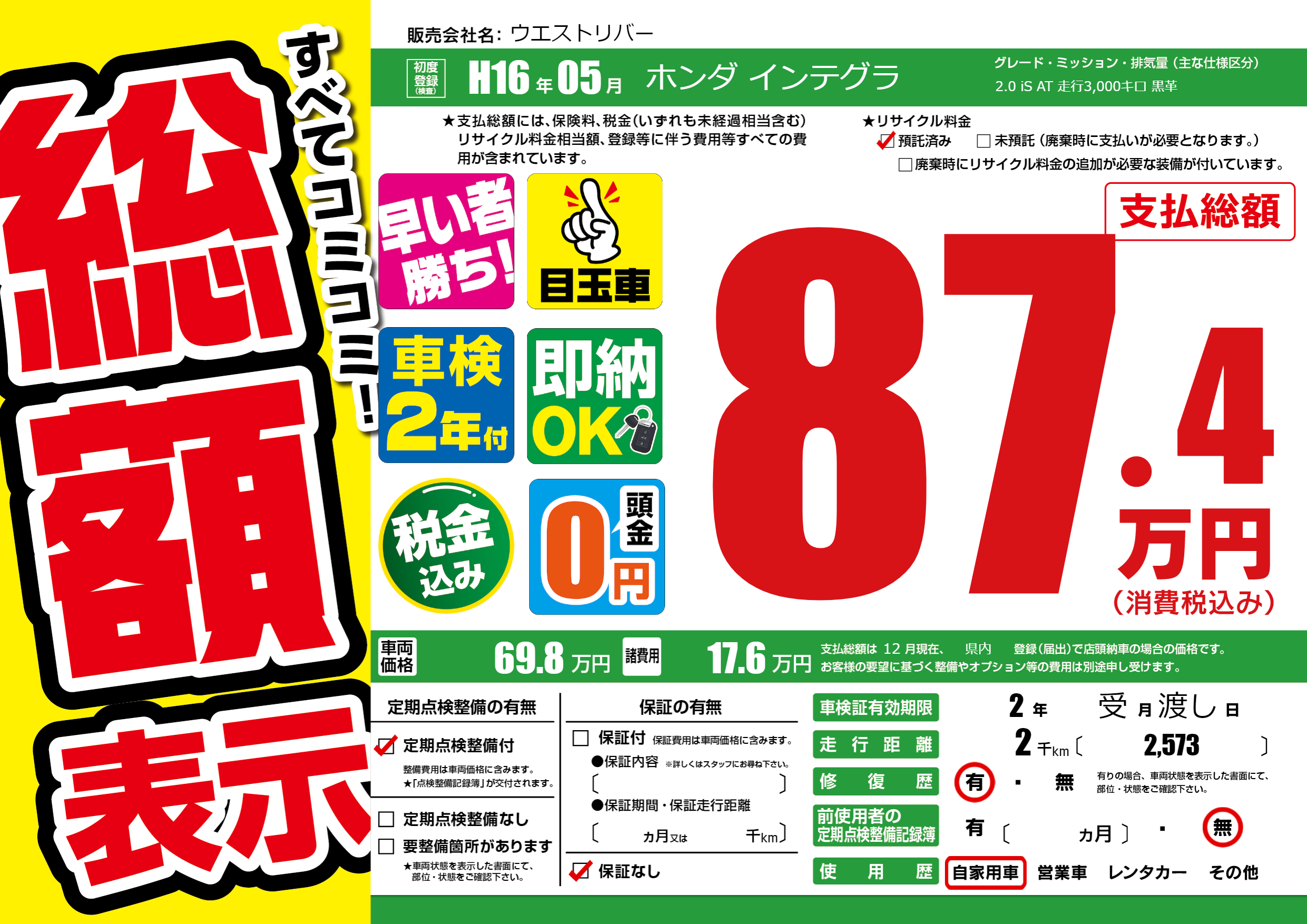 | 走行キロ | 0.2万km | 初年度登録 | H16年05月 |
