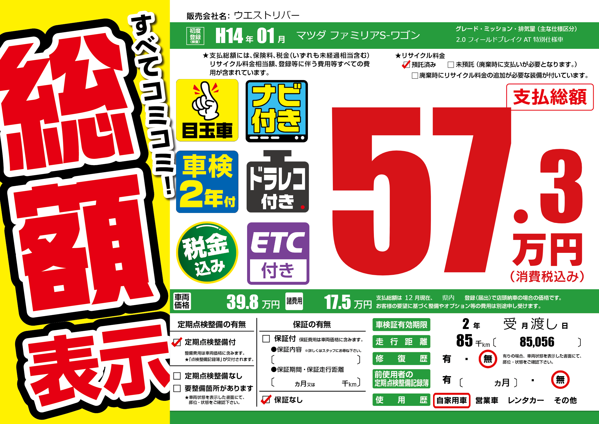 | 走行キロ | 8.5万km | 初年度登録 | H14年01月 |