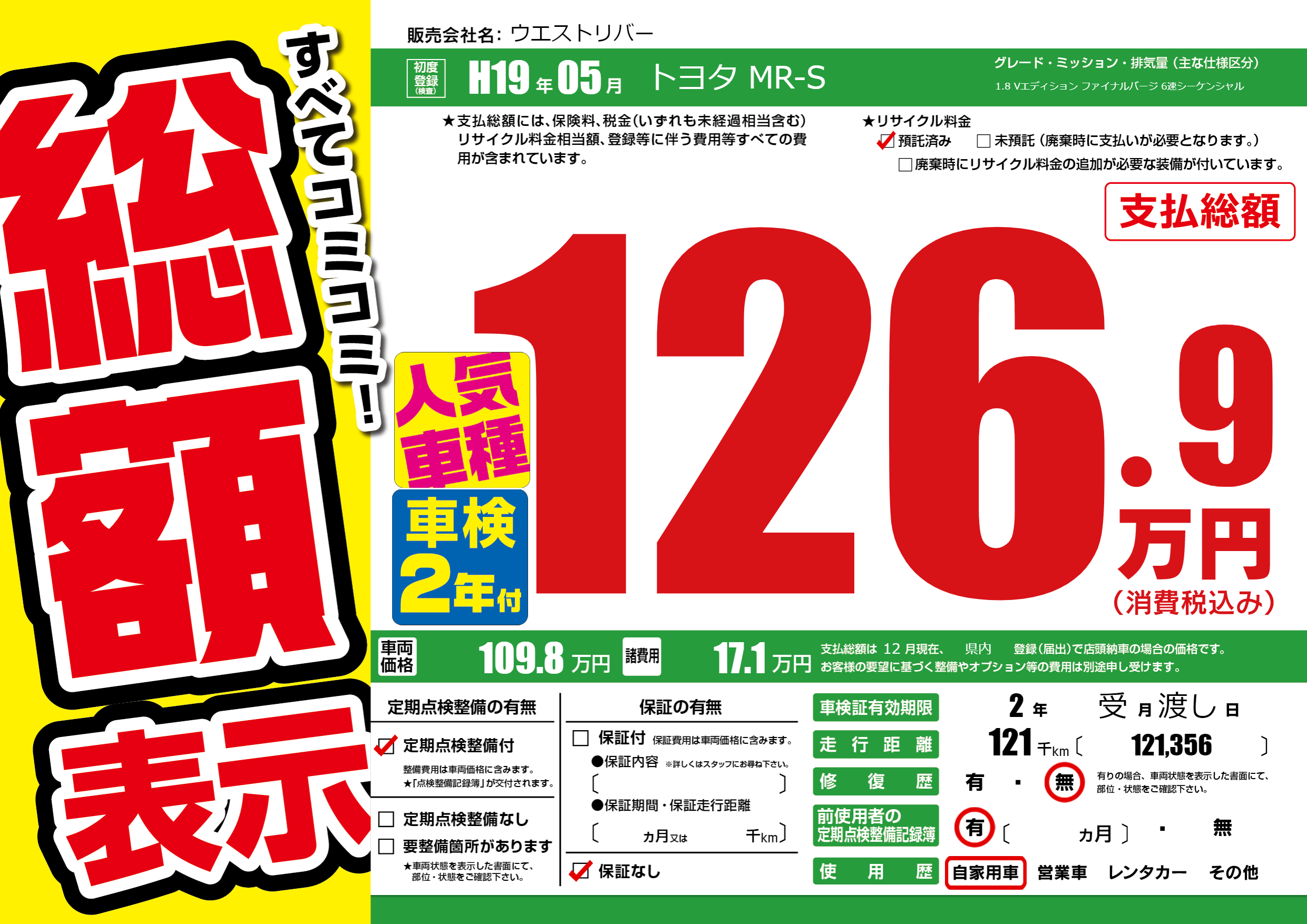 | 走行キロ | 12.1万km | 初年度登録 | H19年05月 |
