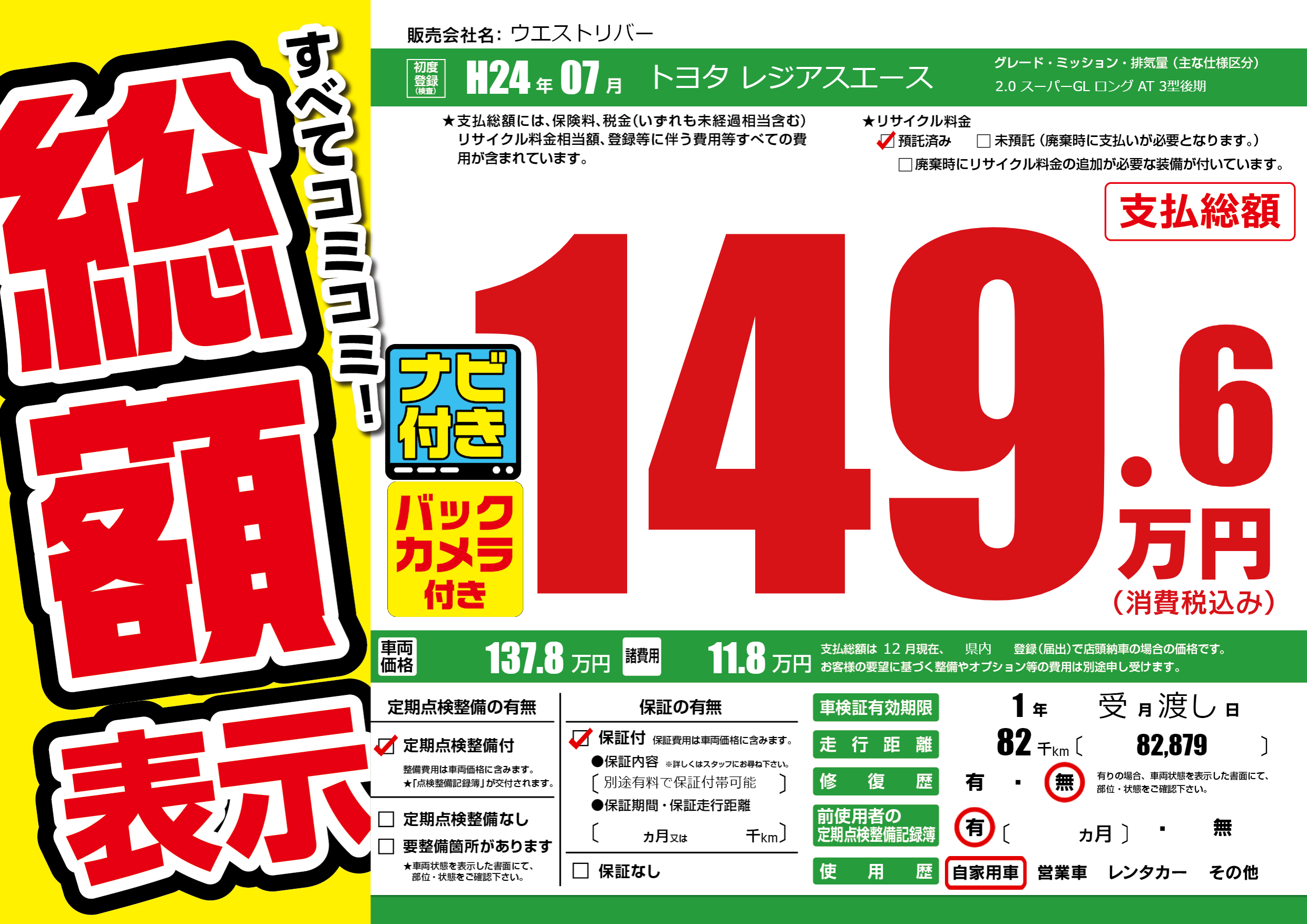 | 走行キロ | 8.2万km | 初年度登録 | H24年07月 |